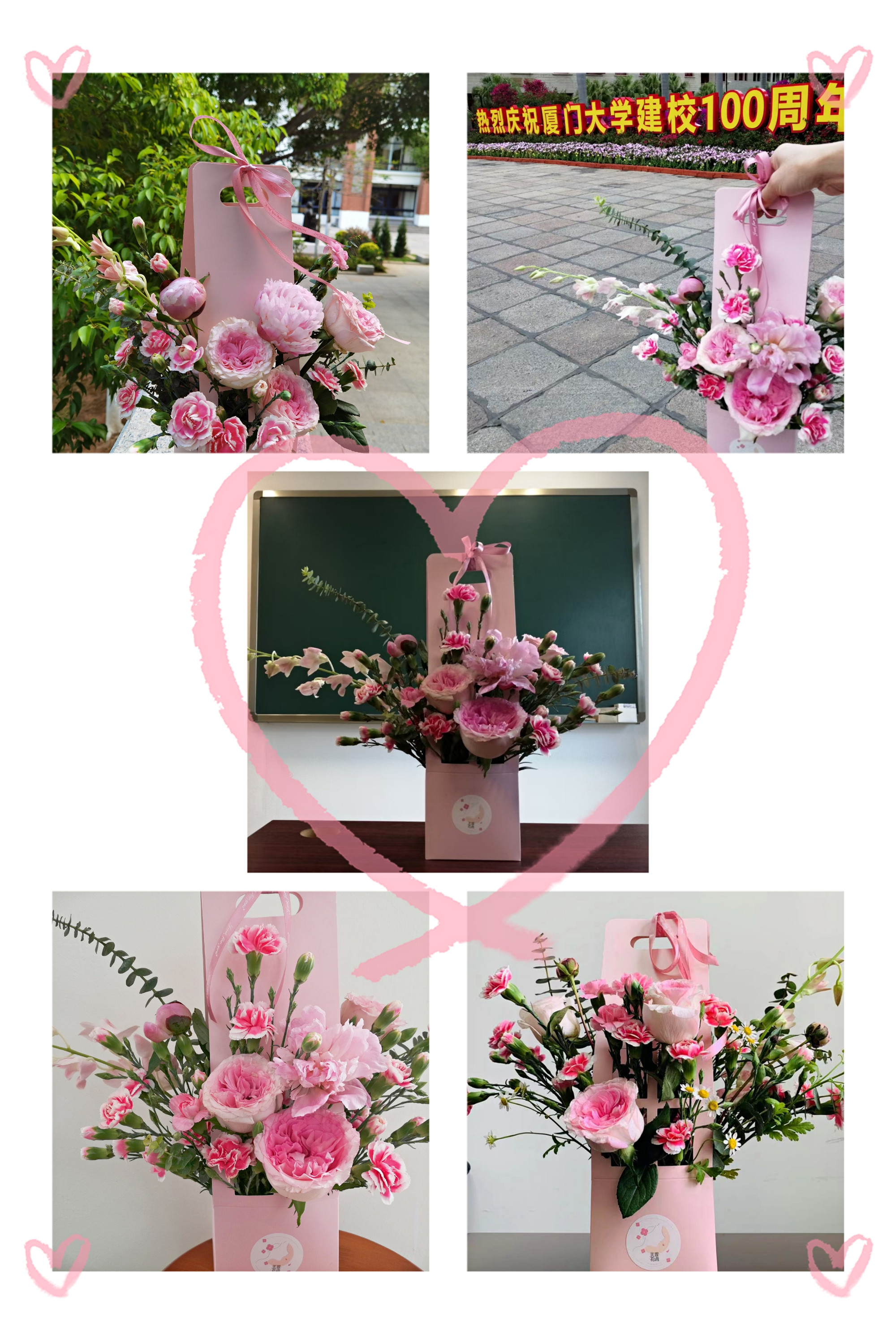 本次花艺活动,以芍药花、洛神玫瑰和康乃馨为主花设计插花作品。美丽动人的芍药花花期最短,代表着女老师们把自己最美丽的青春年华奉献给了课堂讲台。洛神玫瑰花期相对越长,代表着老师们把自己一生的青春都奉献给了教书育人,而康乃馨朴实无华,花期也最长,代表着老师,代表着教师这个职业。大家把本次花艺作品取名为《奉献》。