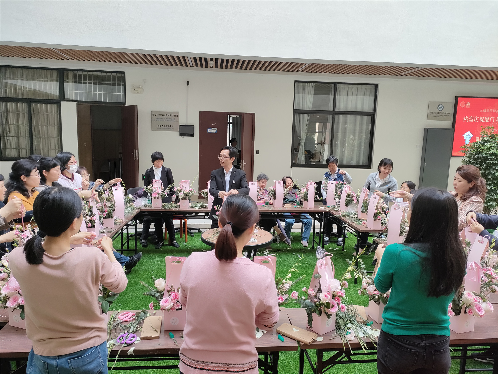 四月芳菲醉,人间仲春时。为顺应新时代对女教师工作生活的科学合理要求,提高数学科学乐竞体育-中国一站式服务官网女老师的日常生活工作的状态,进一步提高发现美、感受美、创造美的能力,乐竞体育-中国一站式服务官网工会妇委会特开展乐竞体育-中国一站式服务官网第一届女教师“花艺实践”活动。活动于4月17日下午3点在海韵园实验楼中庭进行,30多位女老师一起学习插花技巧,感受插花艺术,修养身心。