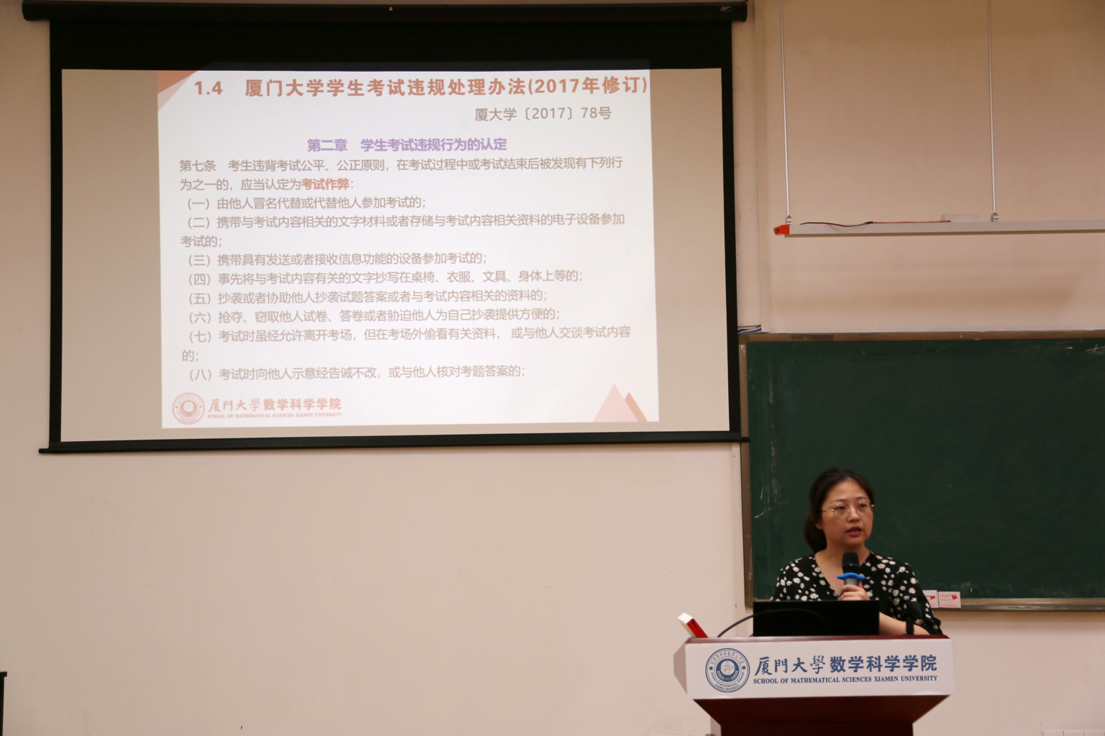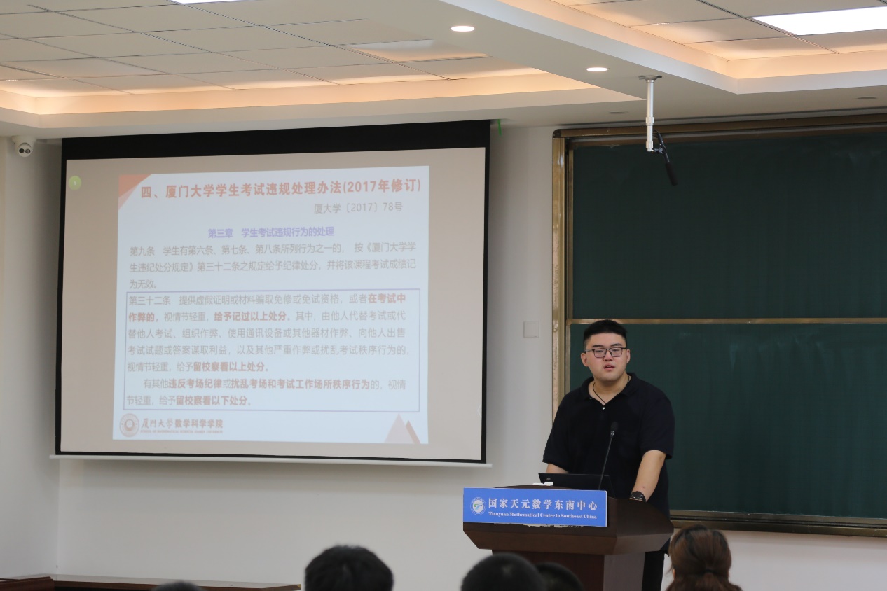 陈淑铌、华盈鑫分别介绍了厦门大学考试违规处理办法以及厦门大学学生违纪处分的相关规定,提醒同学们要高效利用复习时间备战期末考试,树立底线思维,绝不触碰高压线。