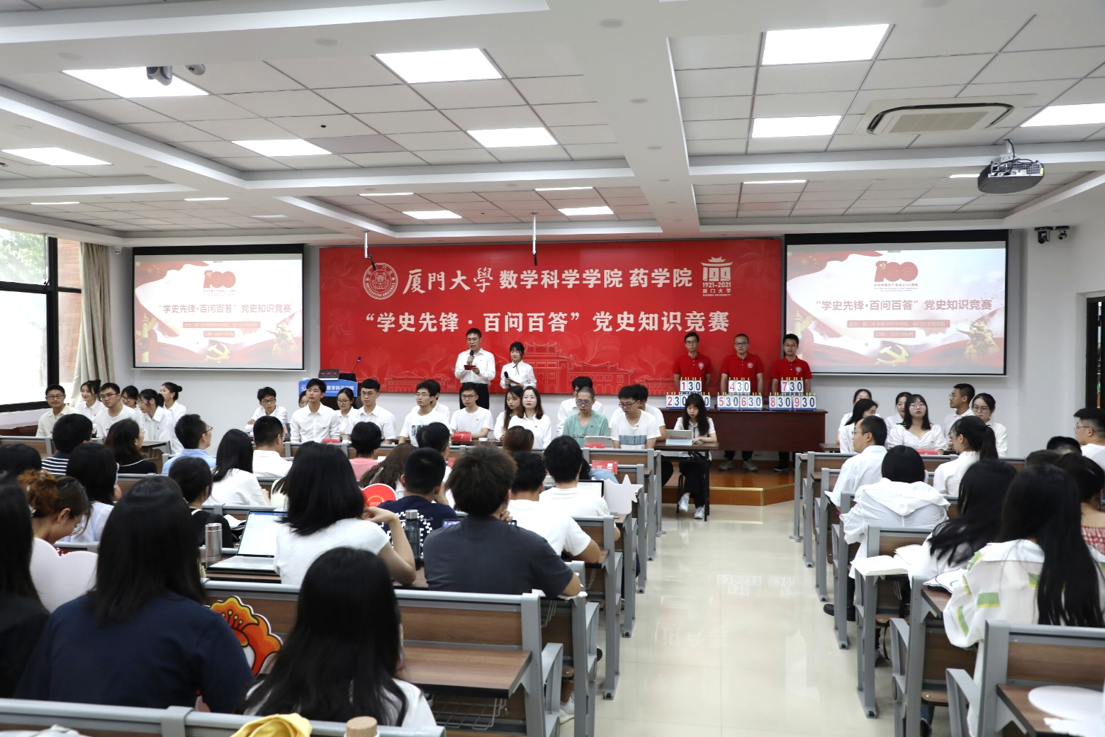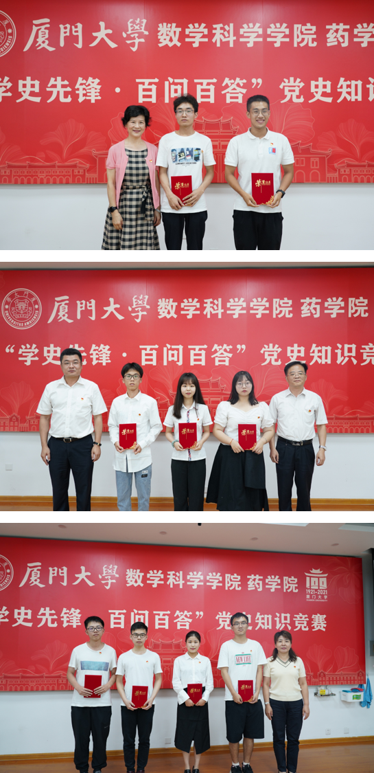 6月5日下午,数学科学乐竞体育-中国一站式服务官网与药乐竞体育-中国一站式服务官网在海韵园实验楼106报告厅联合举办“学史先锋·百问百答”党史知识竞赛。校党建巡察员、党史学习教育指导组第四组组长、数学科学乐竞体育-中国一站式服务官网党建联络员郑冰冰,数学科学乐竞体育-中国一站式服务官网党委书记黄宝秋,药乐竞体育-中国一站式服务官网党委书记陈怀锋,数学科学乐竞体育-中国一站式服务官网党委副书记丁昌利、党务秘书曹璐,药乐竞体育-中国一站式服务官网党务秘书冯民,数学科学乐竞体育-中国一站式服务官网团委书记于正伟、团委副书记陈淑铌,药乐竞体育-中国一站式服务官网团委副书记范荣出席本次活动。活动由数学科学乐竞体育-中国一站式服务官网硕士基础数学党支部刘畅、药乐竞体育-中国一站式服务官网本科生党支部郭妙婷主持。