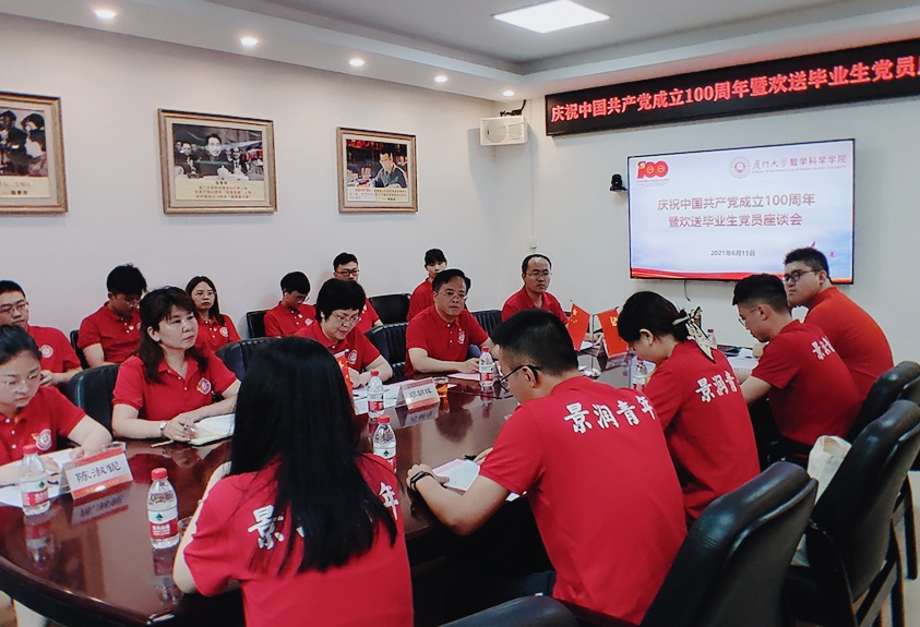 6月15日下午,数学科学乐竞体育-中国一站式服务官网庆祝中国共产党成立100周年暨欢送毕业生党员座谈会在海韵园行政楼B313会议室举行。厦门大学党委常委、副校长邓朝晖,乐竞体育-中国一站式服务官网党委书记黄宝秋,党委副书记丁昌利,团委书记于正伟,团委副书记陈淑铌,辅导员华盈鑫,26名2021届毕业生党员代表共同参加活动。丁昌利主持座谈会。