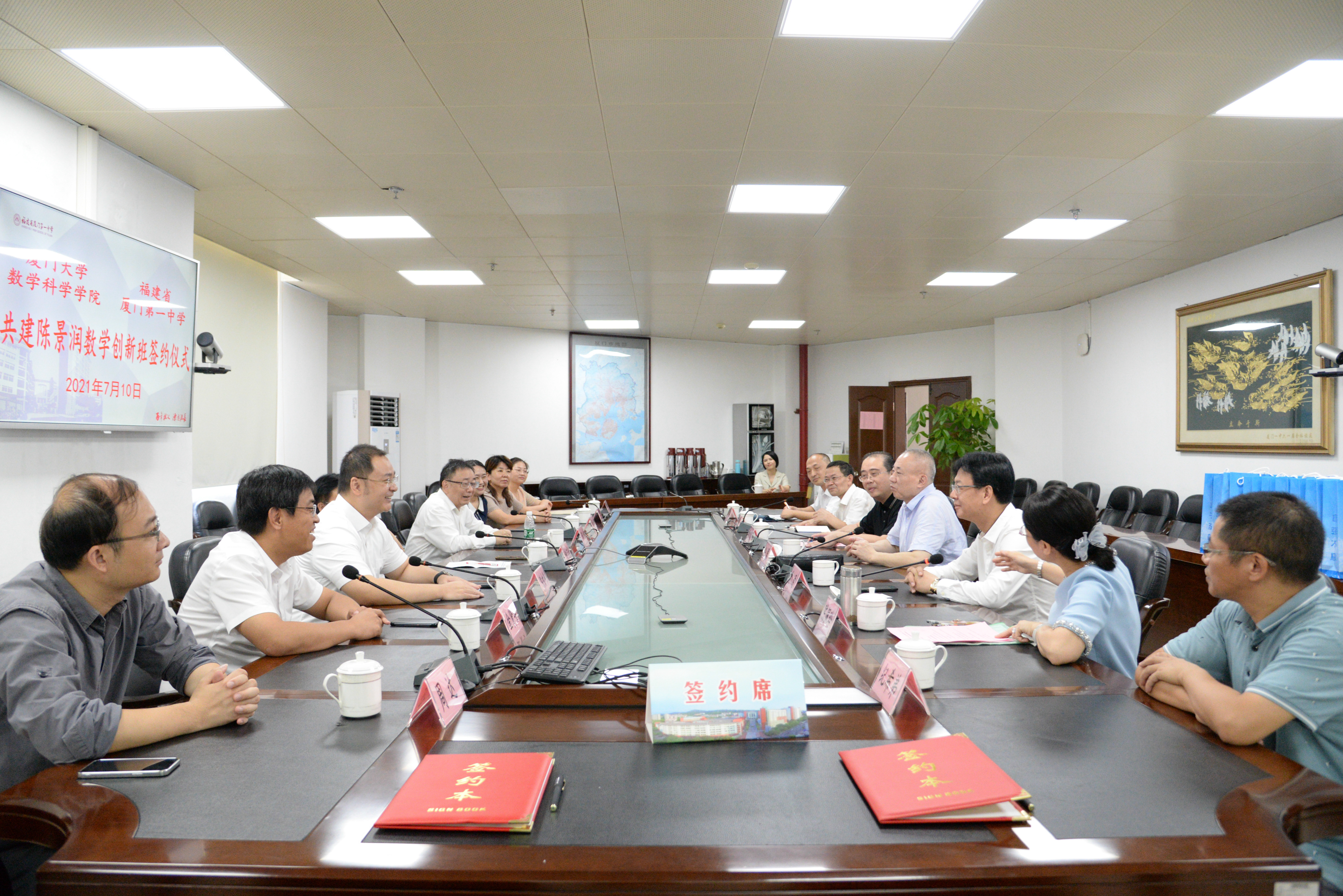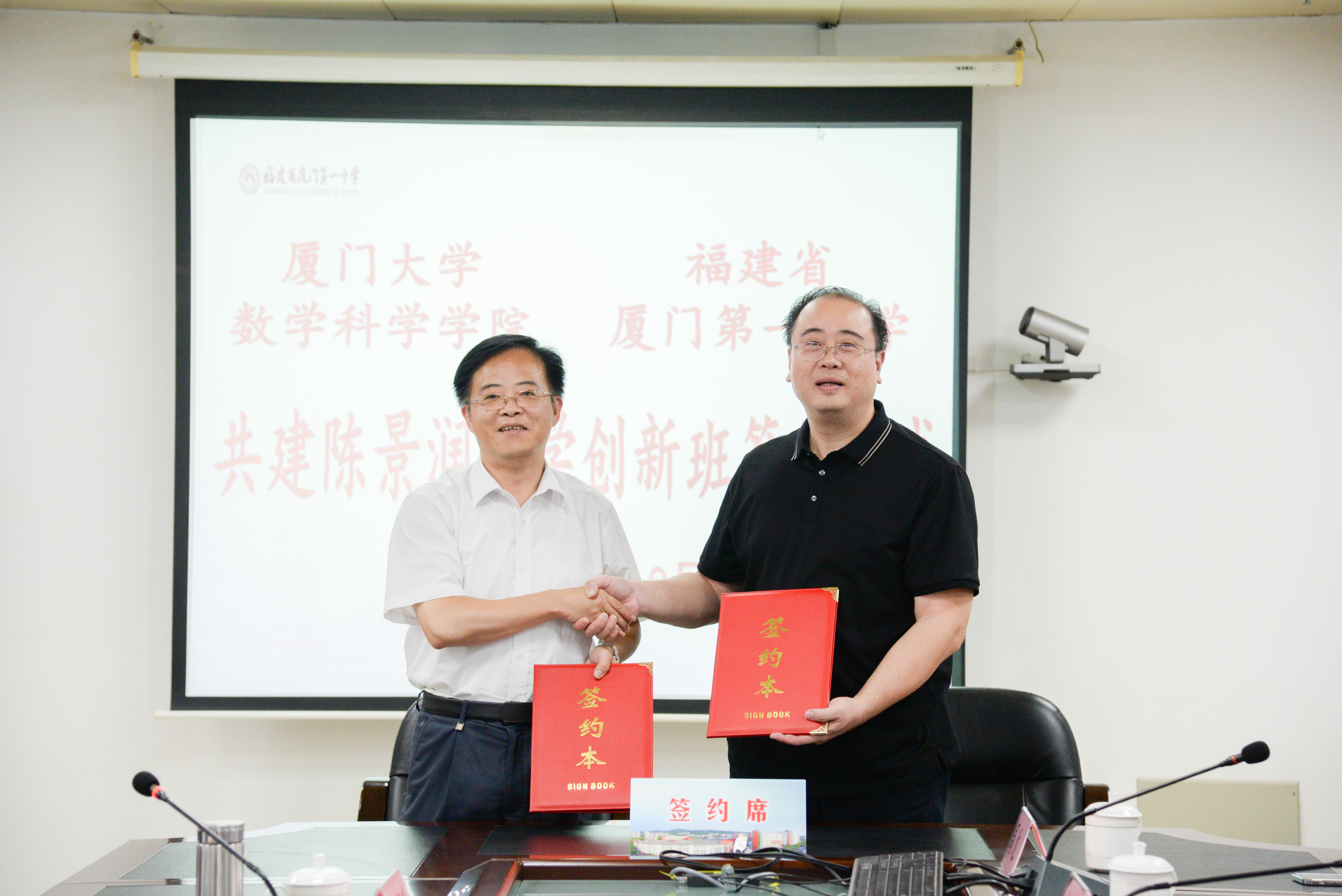 为深入贯彻落实国家关于全面加强基础科学研究总体部署,推进大学、中学数学教育一体化衔接,培养数学英才后备力量,7月10日,数学科学乐竞体育-中国一站式服务官网和厦门一中举行共建陈景润数学创新班签约仪式并为创新班揭牌。数学科学乐竞体育-中国一站式服务官网党委书记黄宝秋,学校科技处处长谭忠,著名数学家陈景润院士的儿子陈由伟,数学科学乐竞体育-中国一站式服务官网副院长金贤安,厦门一中党委书记、校长陈文强,原厦门市教育局巡视员、厦门一中原校长任勇,厦门一中校友会会长、厦门大学88届校友曾通,厦门一中数学正高级教师、特级教师王淼生为创新班揭牌。
