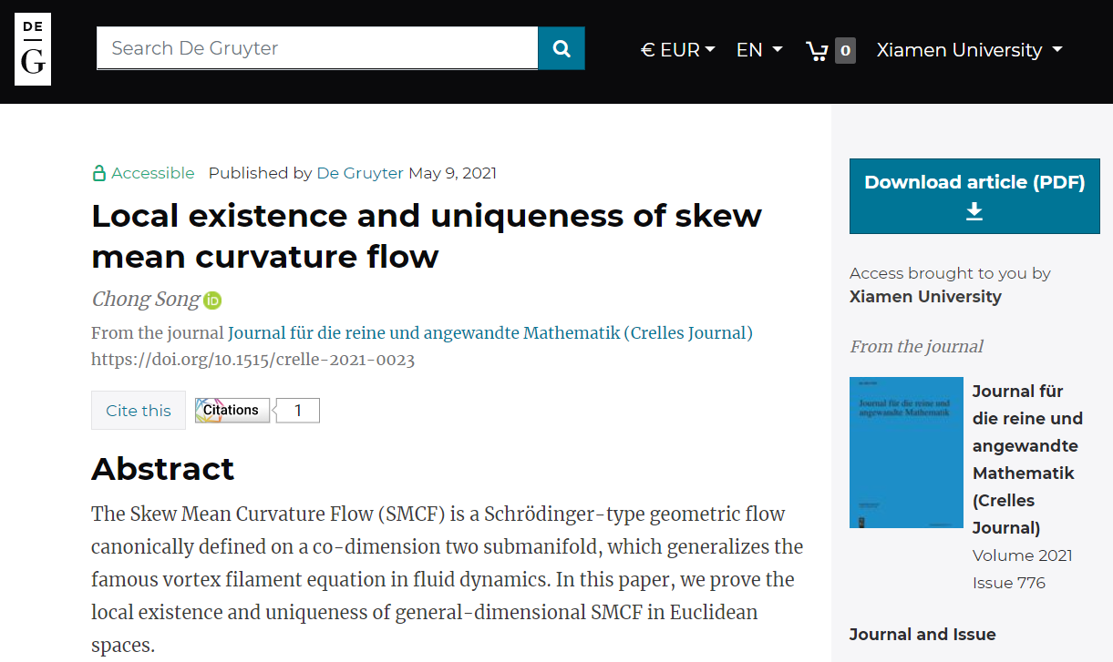 近日,我院青年教师宋翀教授独立完成的成果“Local Existence and uniqueness of skew mean curvature flow”发表在世界著名数学期刊《Journal für die reine und angewandte Mathematik》(也被称为Crelle’s Journal)。该期刊从创刊至今已经有近190年历史,是世界上最古老的top数学学术杂志。