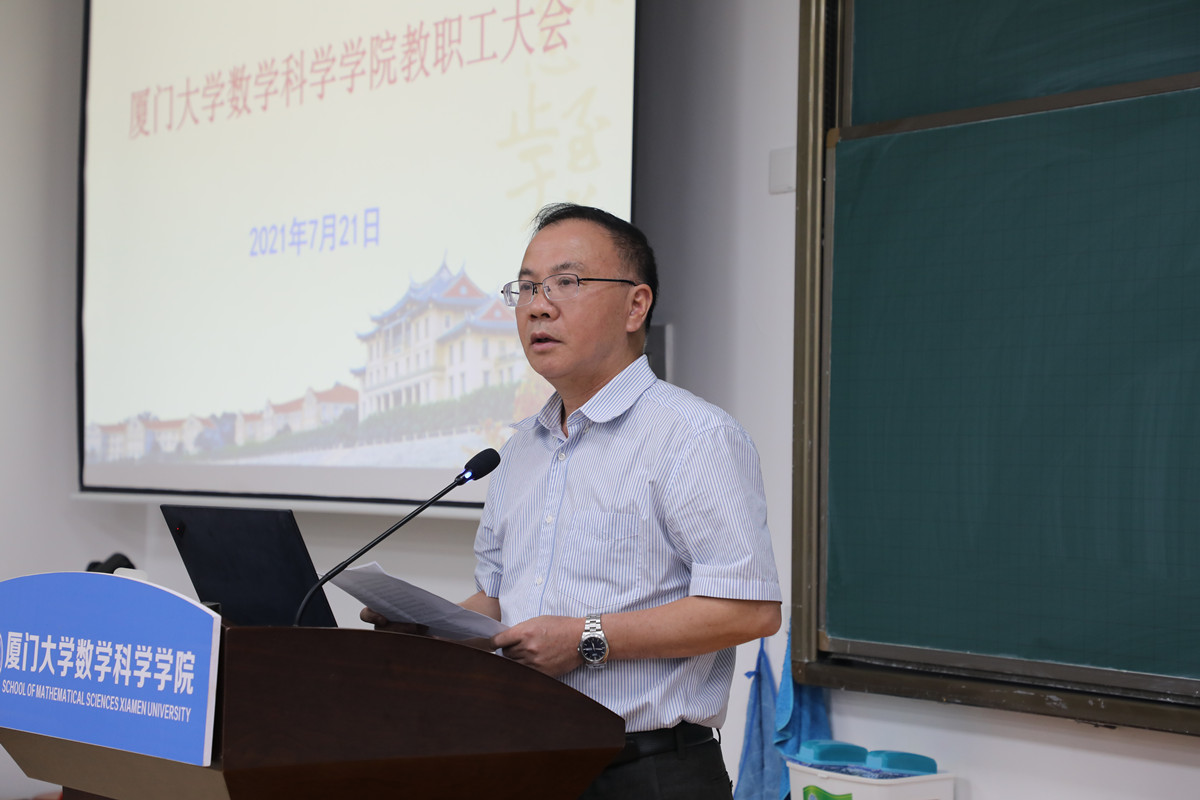 会上,黄宝秋结合学校《关于认真学习贯彻习近平总书记在庆祝中国共产党成立100周年大会上的重要讲话精神的通知》要求,再次传达学习习近平总书记“七一”重要讲话精神,报告乐竞体育-中国一站式服务官网3月下旬以来扎实推进党史学习教育各项工作所取得的阶段性成效,肯定了乐竞体育-中国一站式服务官网在庆祝百年校庆和建党百年活动以及党建思政、教书育人、科学研究、志愿服务、群团工作等方面所取得的成绩,并就几项重点工作作了强调。他指出,习近平总书记“七一”重要讲话是一篇马克思主义纲领性文献,是新时代中国共产党人不忘初心、牢记使命的政治宣言,是我们党团结带领人民以史为鉴、开创未来的行动指南,要深入领会“七一”重要讲话精神的重大意义和丰富内涵,把学习“七一”重要讲话精神同当前开展的党史学习教育结合起来,同学习贯彻落实习近平总书记致厦门大学建校100周年贺信精神结合起来,同统筹推进“双一流”建设结合起来,不断把学习“七一”重要讲话精神引向深入。他认为,了解历史才能看得远,理解历史才能走得远,我们有幸见证了伟大的中国共产党领导全国人民决战决胜脱贫攻坚、全面建成小康社会,有幸见证了中国共产党成立100周年,有幸见证了厦门大学庆祝建校100周年的辉煌时刻,还将继续参加、见证我国于2035年基本实现社会主义现代化、于本世纪中叶建成富强民主文明和谐美丽的社会主义现代化强国,要更加坚定在新时代与党一起创业的信心和决心,把学习“七一”重要讲话精神和开展党史学习教育的成果转化为奋进新征程、建功新时代的实际行动,努力在实现“两个一百年”奋斗目标的宏伟征程中作出应有贡献。他强调,乐竞体育-中国一站式服务官网取得的各项发展成就得益于这个伟大的时代,得益于大家撸起袖子加油干,得益于和谐向上的集体,希望大家继续发扬自强不息、止于至善的校训精神和陈景润先生的科学精神,不忘初心,砥砺前行,努力在新百年新征程中展现数学人的新风采。