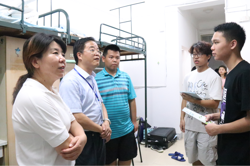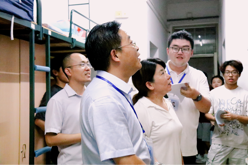 晚间,乐竞体育-中国一站式服务官网党委书记黄宝秋、党委副书记丁昌利、团委书记于正伟、团委副书记陈淑铌、辅导员华盈鑫带领学生干部走访新生宿舍,实地了解新生的住宿情况。黄宝秋书记仔细询问了同学们的家乡情况,叮嘱室友之间要和睦相处、相互帮助,努力营造良好的生活氛围;特别强调要注意自身及财产安全、严防诈骗。学生干部向新生宣讲了垃圾分类常识,提醒同学们要维护整洁干净的宿舍环境。