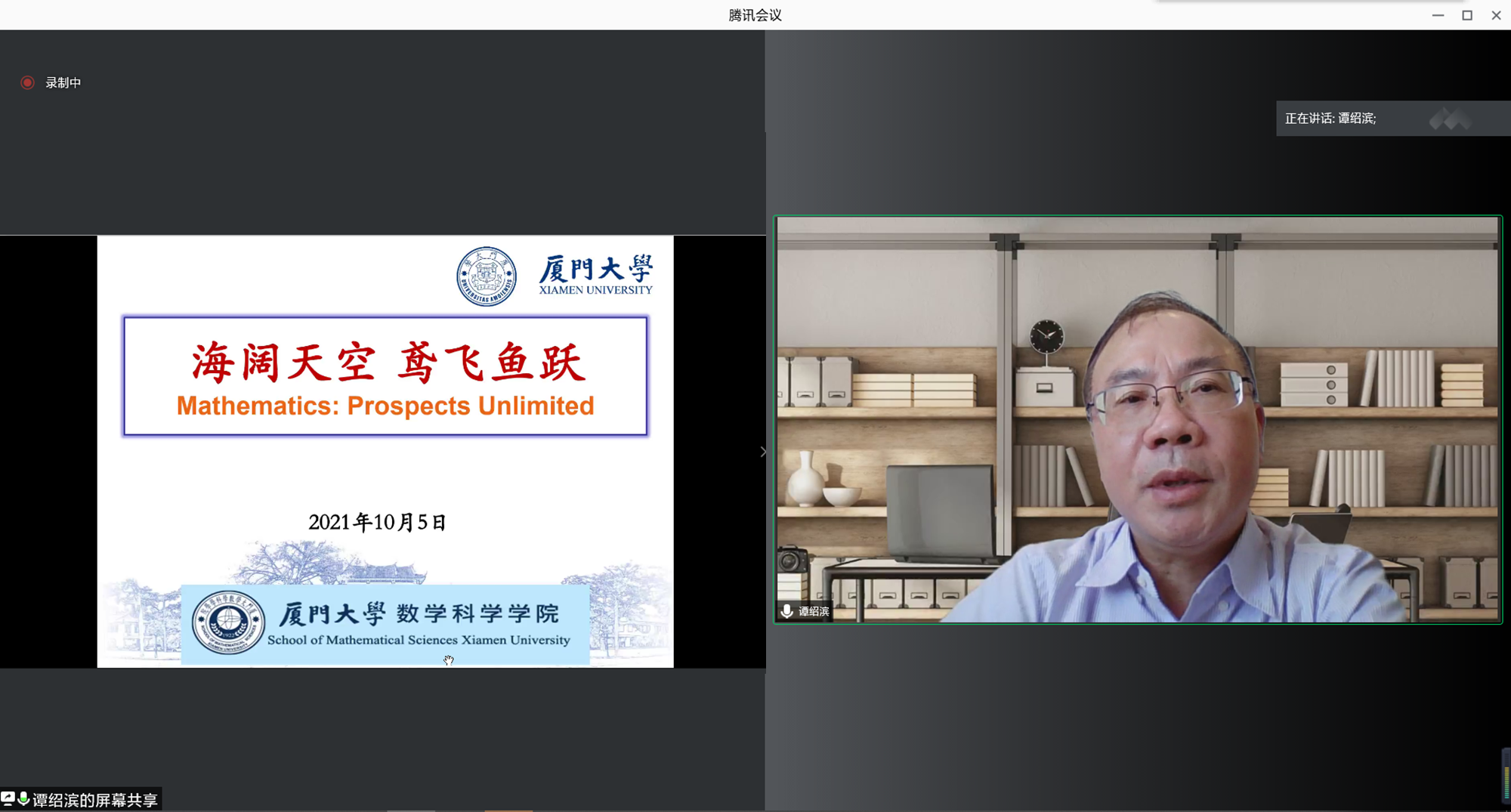 10月5日,数学科学乐竞体育-中国一站式服务官网院长谭绍滨教授为2021级全体本科生上第一堂新生研讨课。根据教学安排与疫情防控要求,本次研讨课在线上进行,数学与应用数学系副主任杜妮副教授、辅导员华盈鑫共同参加。