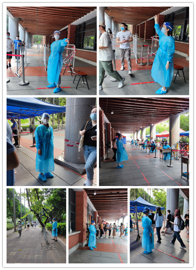 9月18日早上6:30和8:30,12名教工党员分两批准时到达设在科学艺术中心的核酸检测点,在专业人员的指导下迅速穿好防护服,戴好口罩、面屏、手套,准时就位开展维护秩序、现场引导等工作。由于本轮核酸检测时间安排较为集中,军训学生成批参加检测等原因,核酸检测点人流量较大,加大了志愿者的工作难度,但老师们针对现场情况不断完善工作分工和方案,优化工作细节,把上高数课的严谨、热情、细致、耐心用于志愿服务,最终圆满完成核酸检测各项任务,受到现场师生的高度评价。