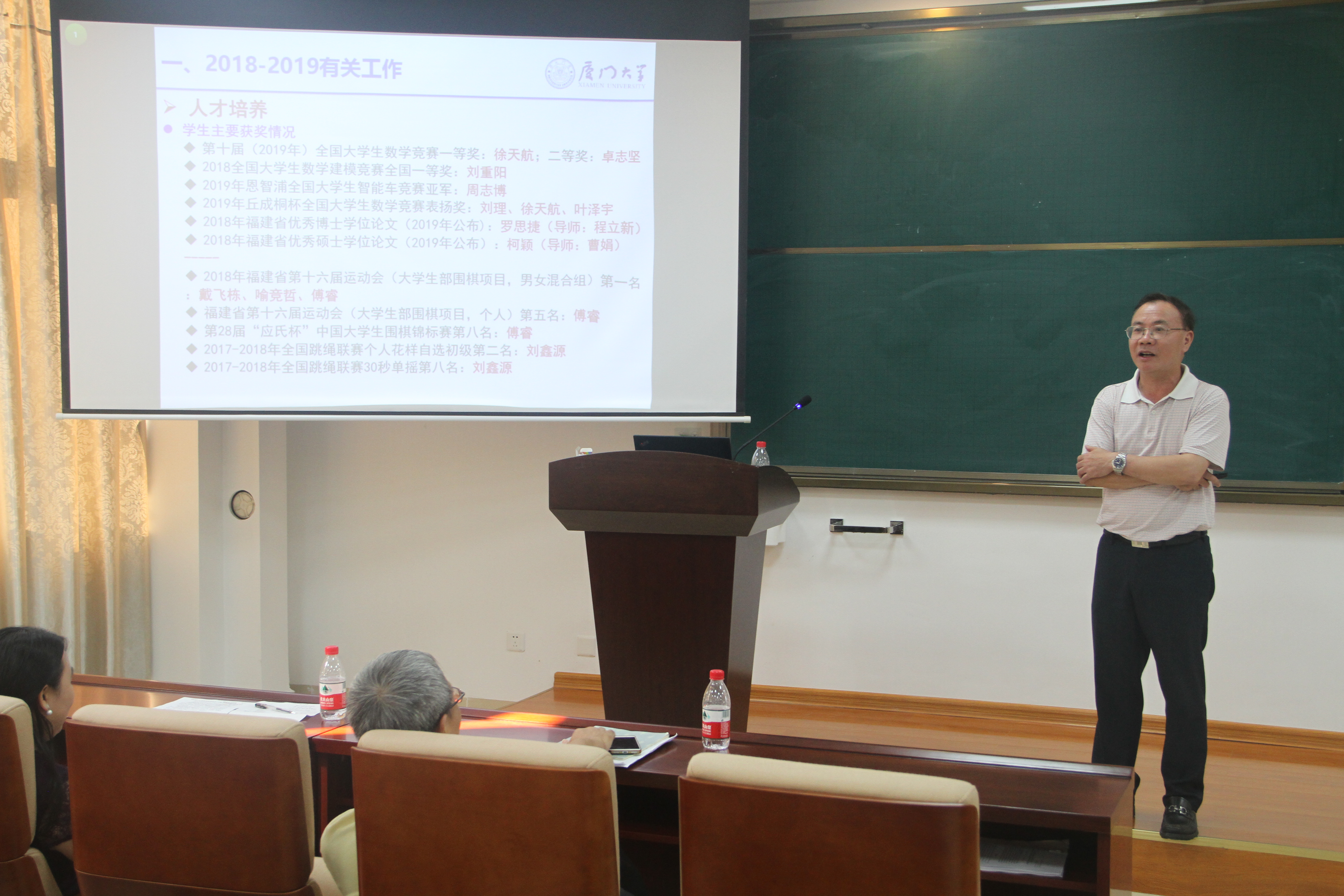 黄宝秋传达了学校近期召开的新学期工作布置会精神,介绍了2019年学校上半年行政工作、党建思政工作主要情况和下半年的重点工作部署,并就乐竞体育-中国一站式服务官网本学期几项重点工作特别是主题教育工作部署和开展国庆70周年庆祝活动等进行了说明,让全体教师更好地了解学校本学期的工作重点和要求,明确了下一步工作安排和努力方向。他指出,当前学校和乐竞体育-中国一站式服务官网推进“双一流”建设、推动高质量内涵式发展已进入关键阶段,我们要以开展“不忘初心、牢记使命”主题教育为契机,进一步团结带领全体党员和师生员工,坚持初心引航、使命铸魂,始终保持斗争精神和斗争能力,砥砺前行,团结奋斗,共同书写好厦大数学教育的“奋进之笔”和数学强国梦的时代篇章。