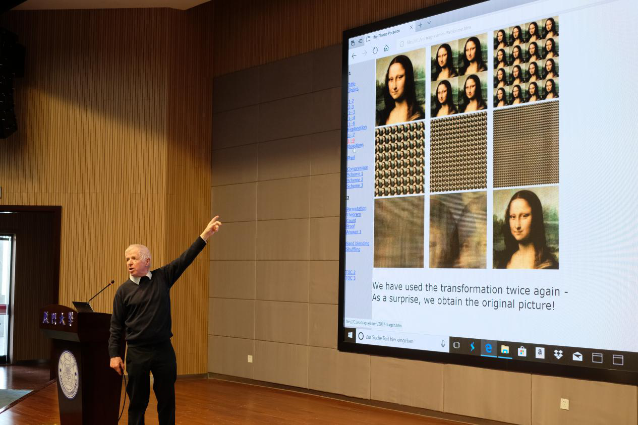 讲座中,Claus Michael Ringel教授讲述了在极少步骤后重现原图的背后数学原理。Ringel教授以一张“蒙娜丽莎”图片为例,经过重复相同的步骤将图片不断等分缩小,原图的细节被模糊,但突然,没有失真的原图会重新出现。随后,Ringel教授通过严谨的数学论证阐释了这一奇特现象背后的数学原理,即每一个置换的阶数是有限的,这一原理在智力玩具的设计中也多有体现。讲座深入浅出、图文并茂,将数学原理与现实生活、智力玩具相互连通,让在场师生受益匪浅。