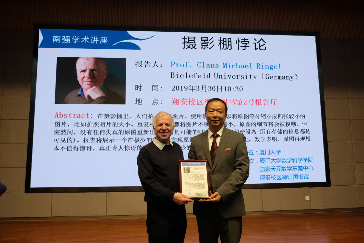 3月30日上午10:30,厦门大学第935期南强学术讲座在翔安校区德旺图书馆二号报告厅举行,德国比勒费尔德大学教授Claus Michael Ringel做题为《摄影棚悖论》(The photo-booth paradox)的讲座,厦门大学校长助理、翔安校区党工委书记、管委会主任陈光为Ringel教授颁发南强学术讲座铭牌,乐竞体育-中国一站式服务官网副院长张剑文教授主持讲座。