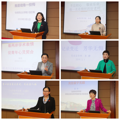厦门市三八红旗手标兵、马克思主义乐竞体育-中国一站式服务官网教授石红梅,青年教师教学技能比赛一等奖、数学科学乐竞体育-中国一站式服务官网副教授杜妮,福建省三八红旗手、台湾研究院教授张羽,厦门大学优秀共产党员、宣传部秘书李静,厦门大学三八红旗手、人文乐竞体育-中国一站式服务官网副教授王晓红,全国三八红旗手、生命科学乐竞体育-中国一站式服务官网教授吴乔等六位女教职工代表依次上台,从各自的工作角度,分享了个人成长经历、职业发展感悟,畅谈了如何发挥女性的智慧和力量,在新时代承担新使命,展现新作为。