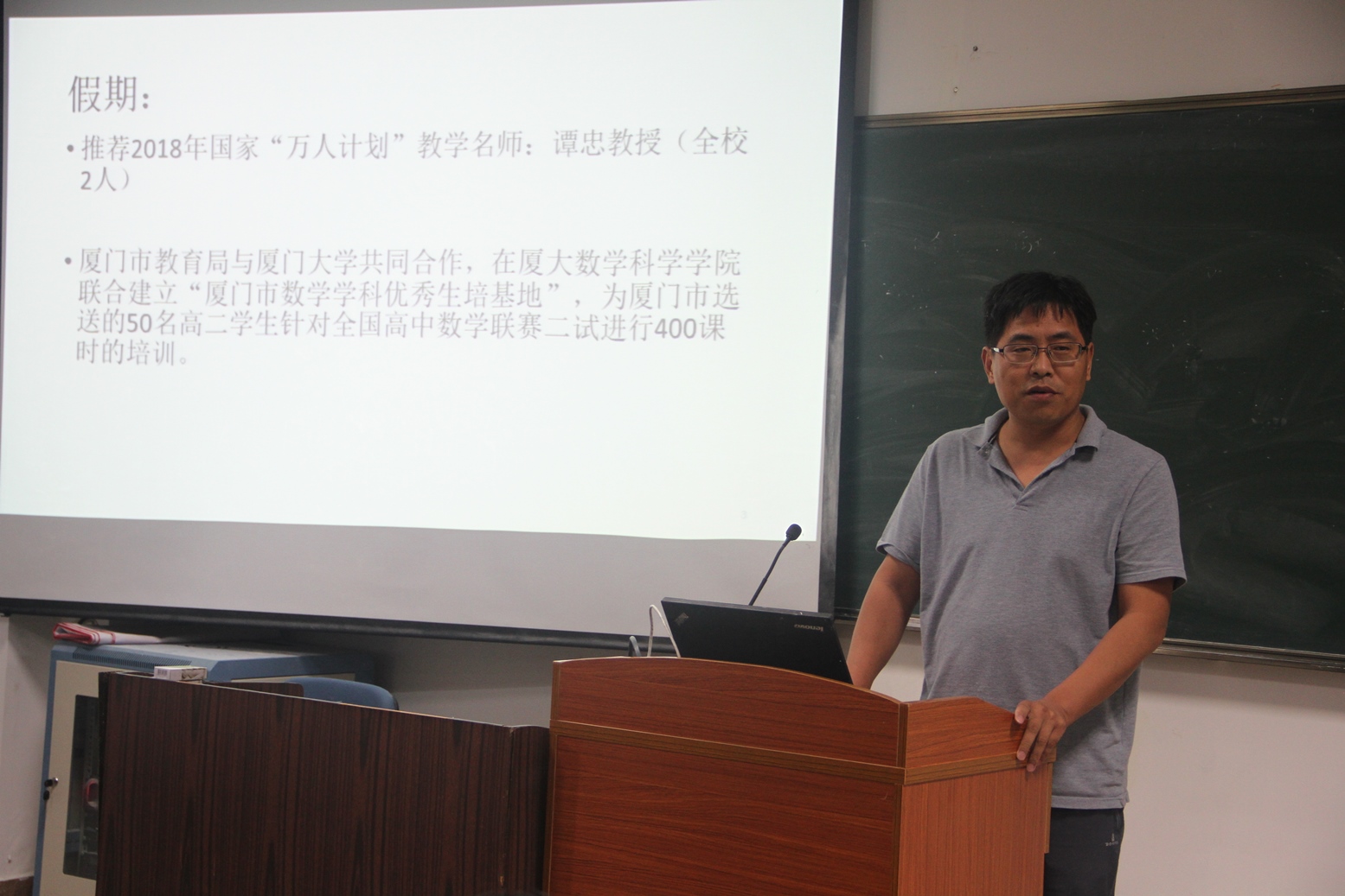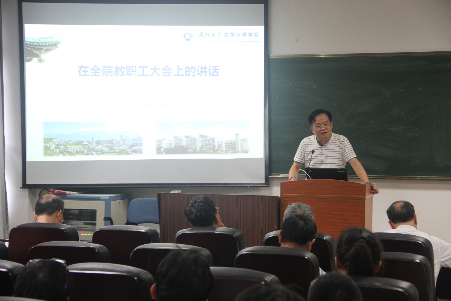 会上,黄宝秋书记传达了学校安全稳定有关工作部署要求和近期重点工作研讨会精神,黄书记强调,要切实加强教师思想政治工作,更加突出立德树人这一根本任务,进一步提高政治站位,增强“四个意识”,守住底线、不越红线、不碰高压线,主动配合学校做好安全稳定工作,确保新学期开学秩序正常,为即将在我校召开的第四届中国“互联网+”大学生创新创业大赛营造良好氛围。要按照学校重点工作部署,认真学习领会全国宣传思想工作会议和全国教育大会精神,发扬爱校荣校、实干兴院的精神,以时不我待、只争朝夕的劲头抓好学校第十一次党代会和乐竞体育-中国一站式服务官网“双一流”建设各项目标任务的落实,以崭新的面貌、一流的状态开创新学期工作良好局面。黄书记还通报了暑假期间乐竞体育-中国一站式服务官网各项工作的进展及取得的成绩,为全体教职员工介绍了本年度新进教师,通报了乐竞体育-中国一站式服务官网2018级新生报到情况,欢迎他们加入数学大家庭。
