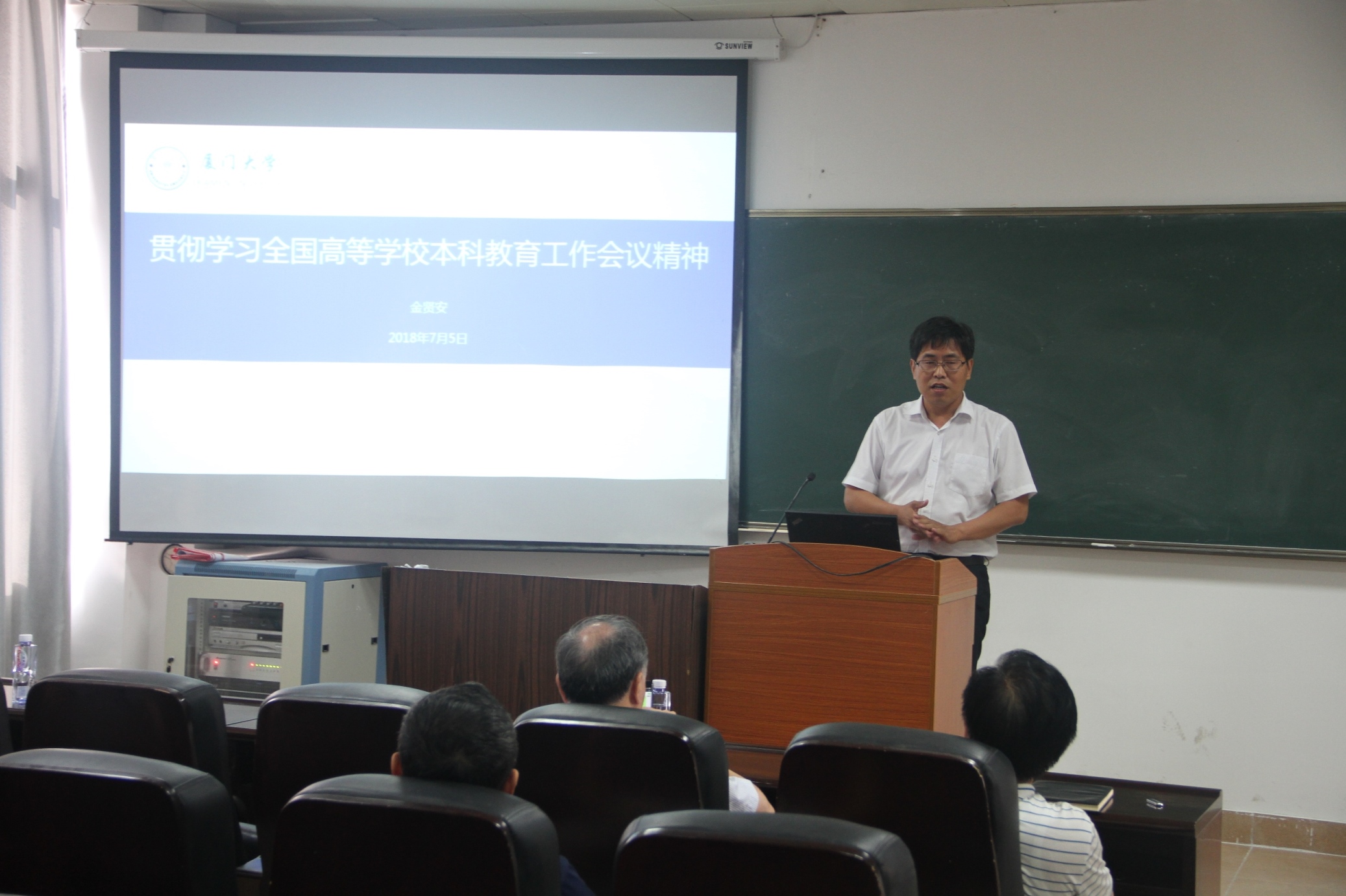金贤安副院长传达了新时代全国高等学校本科教育工作会议精神。他结合会议基本情况和教育部陈宝生部长讲话精神两方面进行传达。6月21日,教育部在四川成都召开新时代全国高等学校本科教育工作会议。会议强调,要深入学习贯彻习近平新时代中国特色社会主义思想和党的十九大精神,全面贯彻落实习近平总书记今年5月2日在北京大学师生座谈会上重要讲话精神,坚持“以本为本”,推进“四个回归”,加快建设高水平本科教育、全面提高人才培养能力,造就堪当民族复兴大任的时代新人。