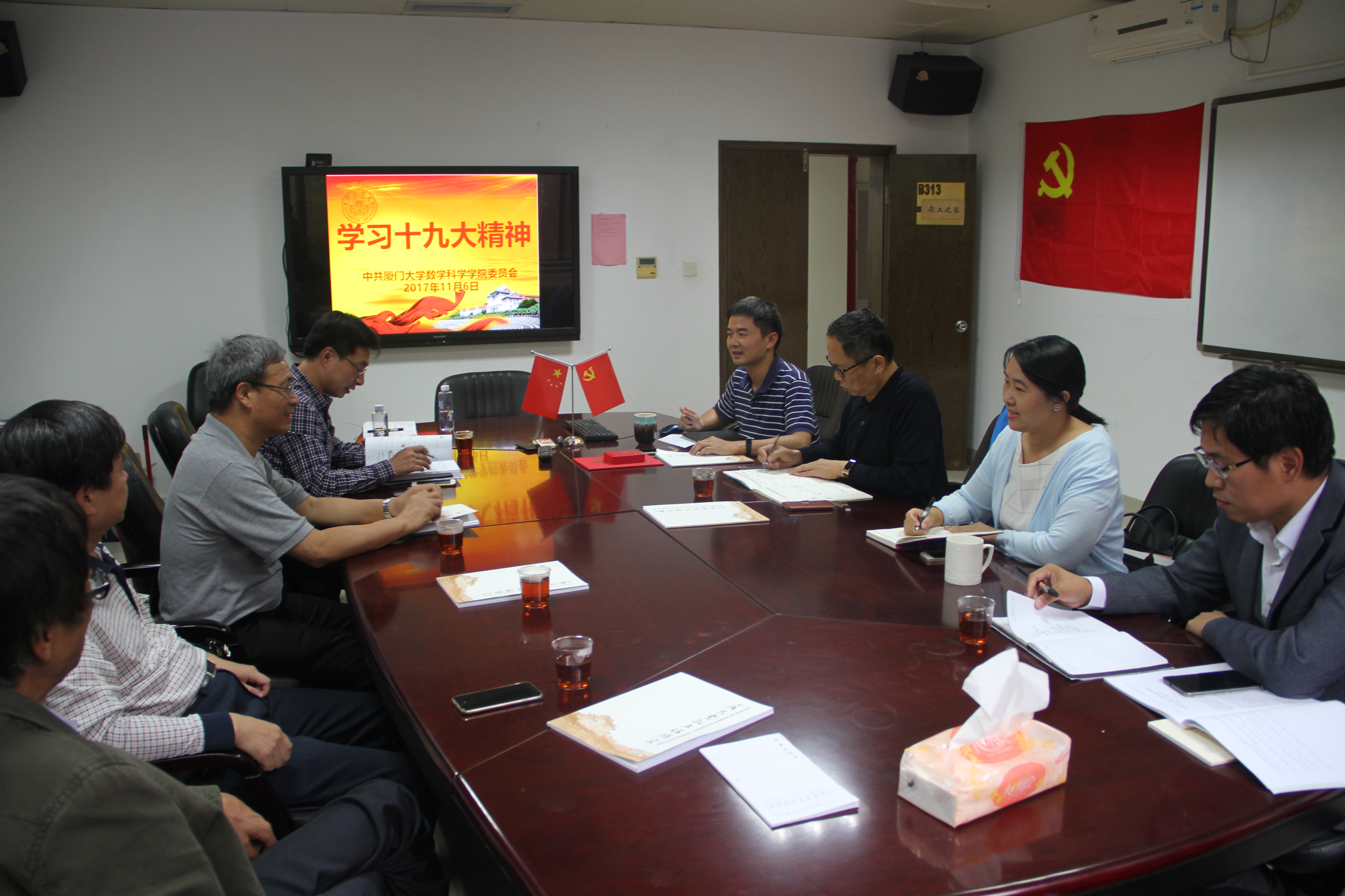 全体委员共同观看习近平带领中央政治局常委瞻仰中共一大会址并发表重要讲话视频,集体上了一党生动的党课。党委书记张明智传达《中共中央关于认真学习宣传贯彻党的十九大精神的决定》主要内容,强调学习贯彻党的十九大精神是我们当前和今后一个时期首要政治任务,一定要在学懂弄通做实上下功夫。指出院党委要发挥示范带头作用,坚持正确导向,创新形式载体,与推进“双一流”建设和改革发展各项事业相结合,按照校党委统一部署,团结带领全院师生将落实十九大各项工作推向纵深。