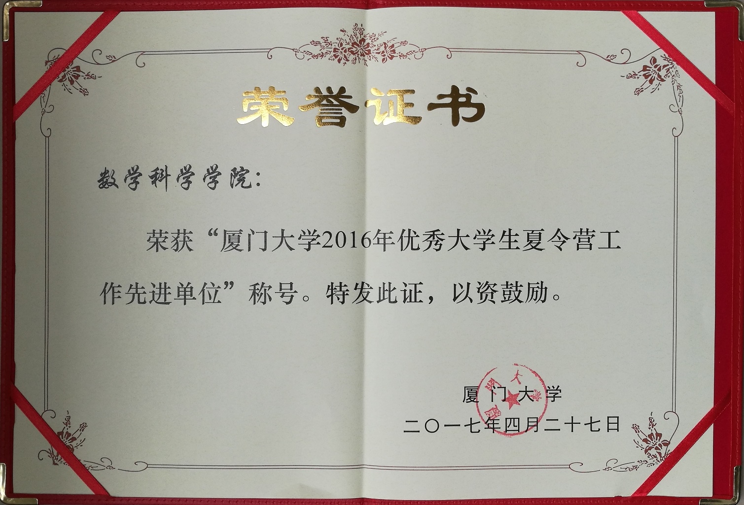 4月27日下午,学校在颂恩楼220会议室召开会议,总结表彰2016年大中学生夏令营工作,并对2017年大中学生夏令营工作进行部署。会上,学校共表彰了15个“厦门大学2016年优秀大学生夏令营工作先进单位”和29名“厦门大学2016年大中学生夏令营优秀工作者”。我院荣获“厦门大学2016年优秀大学生夏令营工作先进单位”称号,乐竞体育-中国一站式服务官网分管研究生工作副院长邱春晖教授代表乐竞体育-中国一站式服务官网上台领奖。同时,乐竞体育-中国一站式服务官网研究生秘书陈李媛获评“厦门大学2016年大中学生夏令营优秀工作者”。