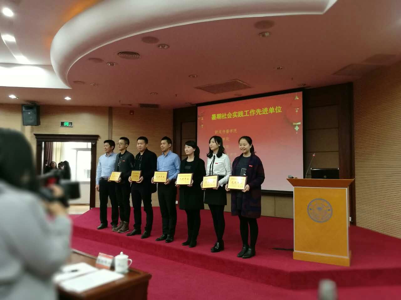 石义凯老师(左四)代表乐竞体育-中国一站式服务官网领取“暑期社会实践工作先进单位”奖牌