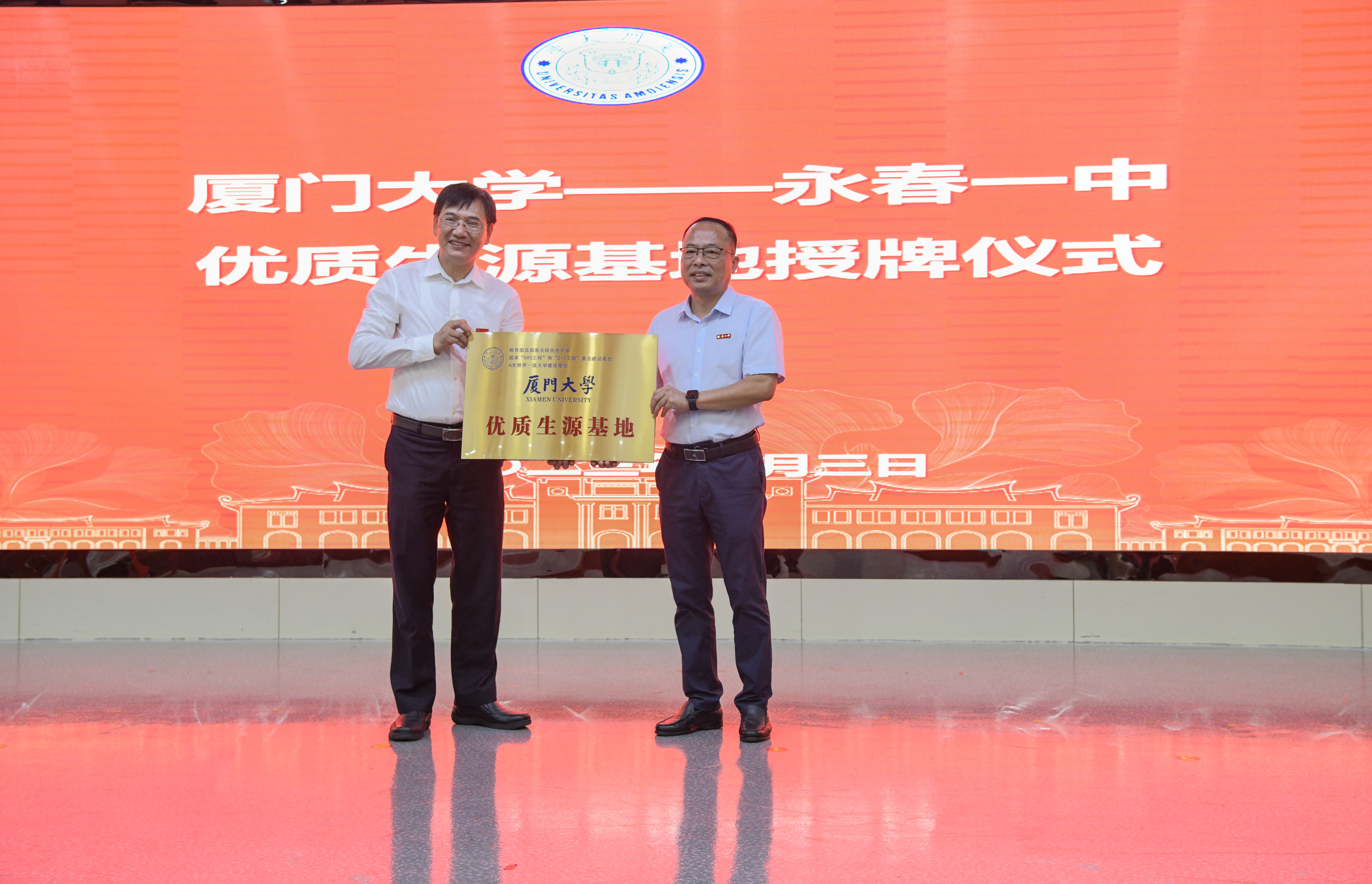 为了加强我校与永春一中的联系,进行了隆重的厦门大学优质生源基地授牌及赠书仪式。洪院士代表厦门大学向永春一中授予厦门大学优质生源基地牌匾,邱春晖教授代表学校向永春一中赠送了特色书籍。