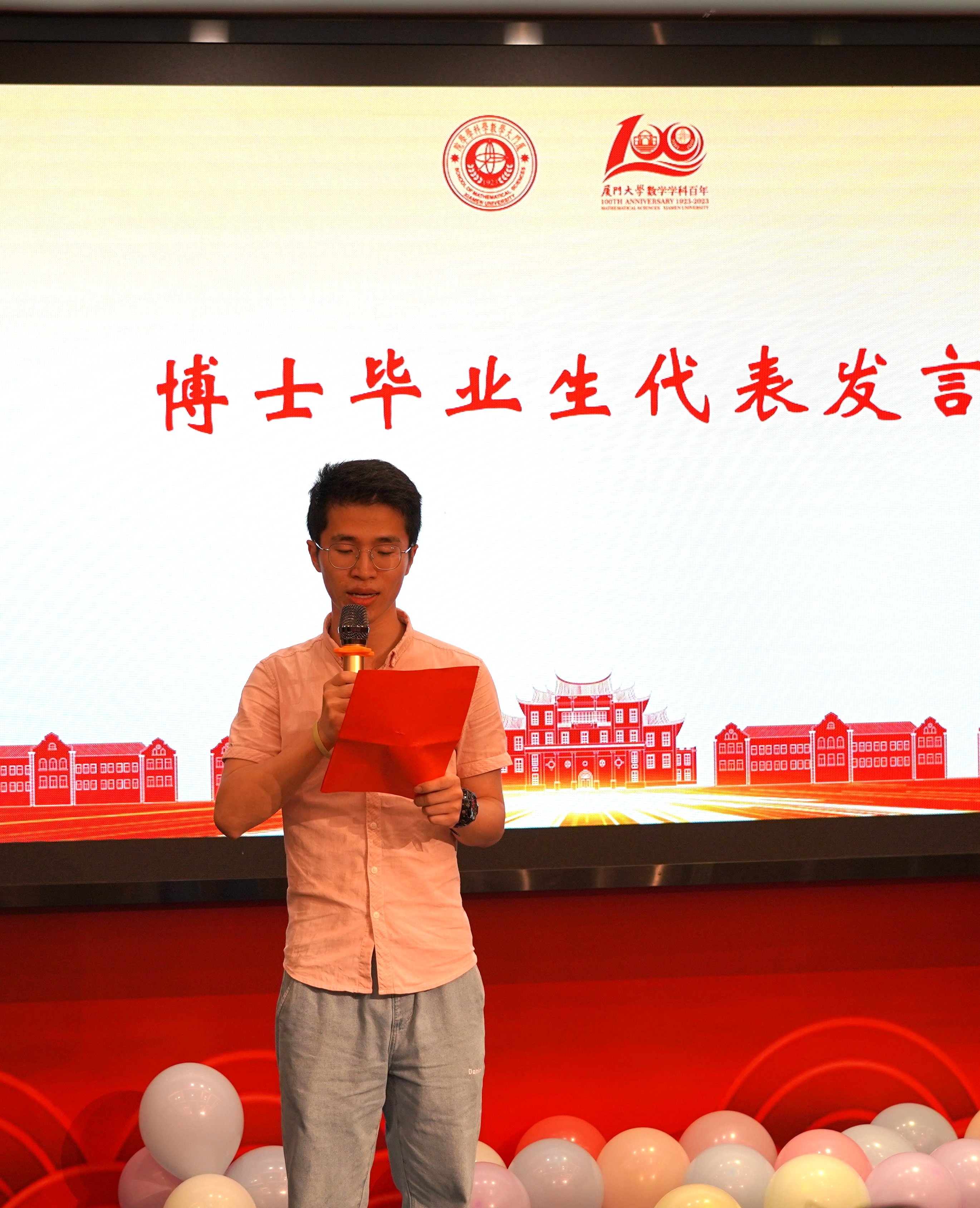 2019级本科生李龙泉、2020级硕士生严凌云、2018级博士生吴忠二代表乐竞体育-中国一站式服务官网2023届毕业生感谢母校、母院、师长与同学,回忆在数院的学习生活时光。他们表示,在乐竞体育-中国一站式服务官网的学习生活中,自己不仅打牢了专业知识基础,同时也树立起坚定的理想信念。他们即将从厦大出发奔赴祖国各地,未来将继续传承弘扬嘉庚精神,脚踏实地、勇毅前行,在各行各业发光发热,把个人奋斗融入国家发展大局,将青春播撒在广袤的祖国大地上。
