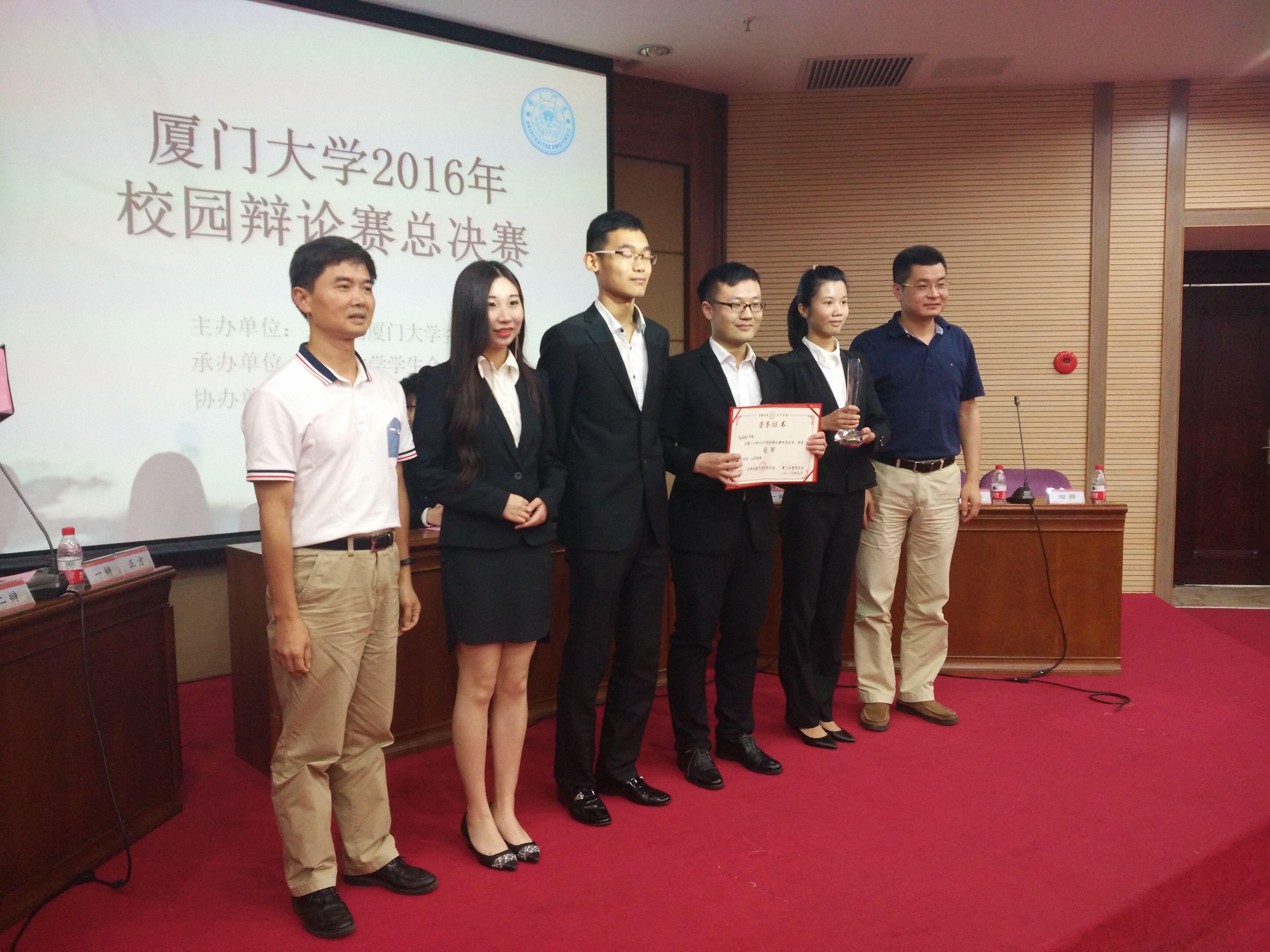 最终,我院辩论队夺得了2016年厦门大学校园辩论赛冠军。校团委书记陈怀锋和乐竞体育-中国一站式服务官网党委书记张明智为辩论队颁发了证书和奖杯。