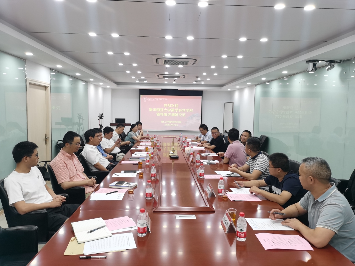 为深入学习贯彻党的二十大精神,进一步落实落细两校战略合作协议,持续加强两院交流合作,7月23日上午,贵州师范大学数学科学乐竞体育-中国一站式服务官网党委书记孙谦、院长卢琳璋率团访问我院,在数理大楼686会议室召开座谈会,积极探讨深化两院务实合作事项,并开展理论联学研讨。我院党委书记张清榕、副院长张剑文、金贤安、朱玉峻及各系(部)相关负责人参加会议。会议由张清榕主持。