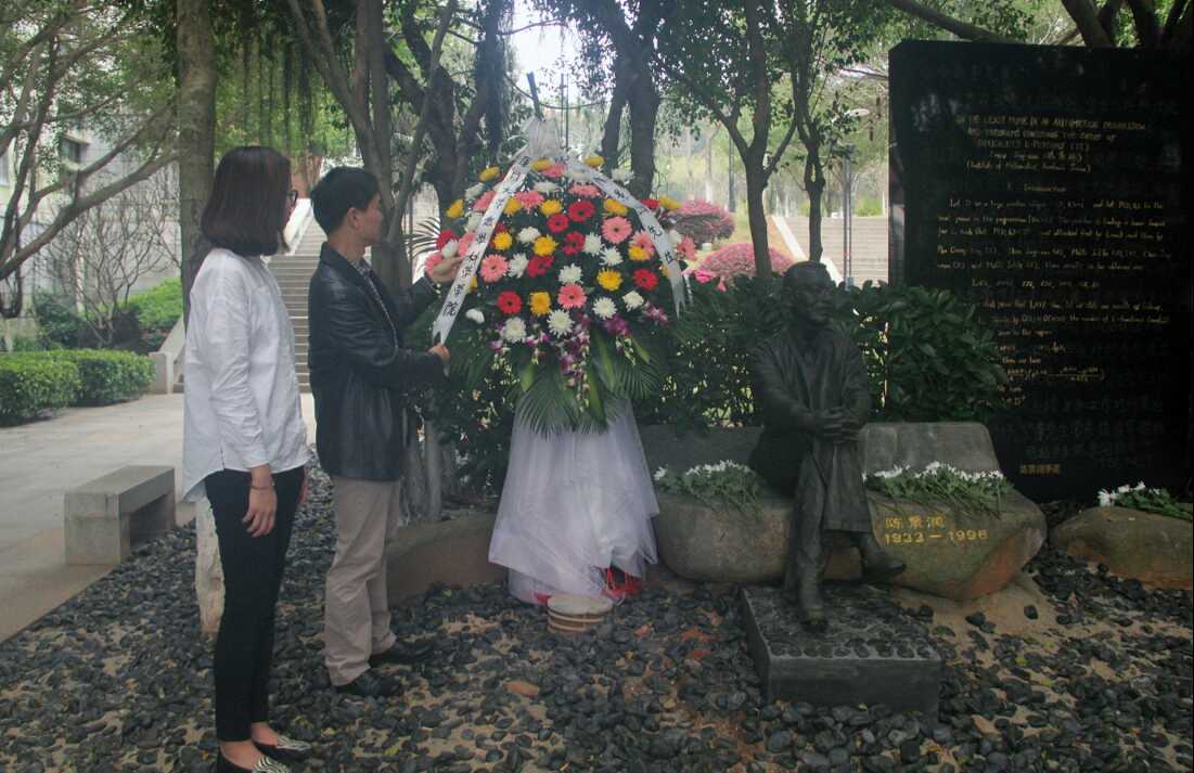 上午九点半,祭扫活动在庄严肃穆的气氛中开始。首先,由主持人介绍陈景润先生的生平。随后,由师生代表张明智书记与15级谢昕伶同学向陈景润铜像敬献花篮。