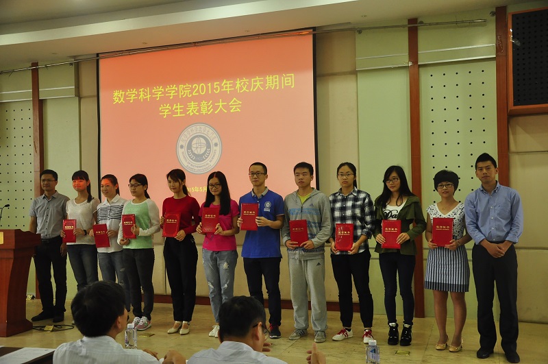 首先,由大会主持人张剑文副书记宣读了数学科学乐竞体育-中国一站式服务官网2015年校庆期间学生表彰决定。各位领导和老师们分别为2015年校庆期间校级奖学金的获得者、2015年厉则治大学生成长奖学金的获得者、2015年快乐学习奖学金的获得者、2015年启德奖学金的获得者、2014年度厦门大学和数学科学乐竞体育-中国一站式服务官网共青团工作先进个人以及2014年度厦门大学和数学科学乐竞体育-中国一站式服务官网共青团工作先进集体、先进班集体标兵颁发证书,并与同学们亲切合影。