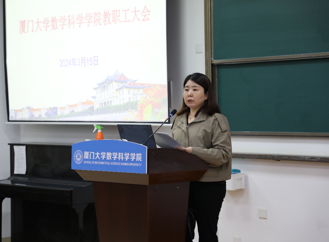 会上,丁昌利副书记领学了习近平总书记在全国两会期间的重要讲话和两会精神。她指出,今年全国两会是在迎接新中国成立75周年的重要时间节点和实现“十四五”规划目标任务关键阶段召开的一次重要会议。习近平总书记在全国两会期间发表的系列重要讲话,深入阐述了一系列事关中国式现代化的重大理论和实践问题,为我们在新征程上把握时代大势、找准工作坐标、抓住大事要事、细化方法路径提供了根本遵循。全院上下要迅速掀起学习贯彻习近平总书记在全国两会期间的重要讲话和两会精神的热潮,发挥党员领导和支部骨干示范带头作用,开展形式多样的宣传活动;要把学习贯彻习近平总书记重要讲话和全国两会精神作为当前重要政治任务,纳入党建和各项工作规划,坚决贯彻落实党中央决策部署,纵深推进数学学科建设迈上新台阶;要把发展新质生产力作为建设世界一流学科的核心动力,深刻把握学校新学期工作部署要求,以党建与事业发展深度融合为主要思路,推动各项事业高质量发展。