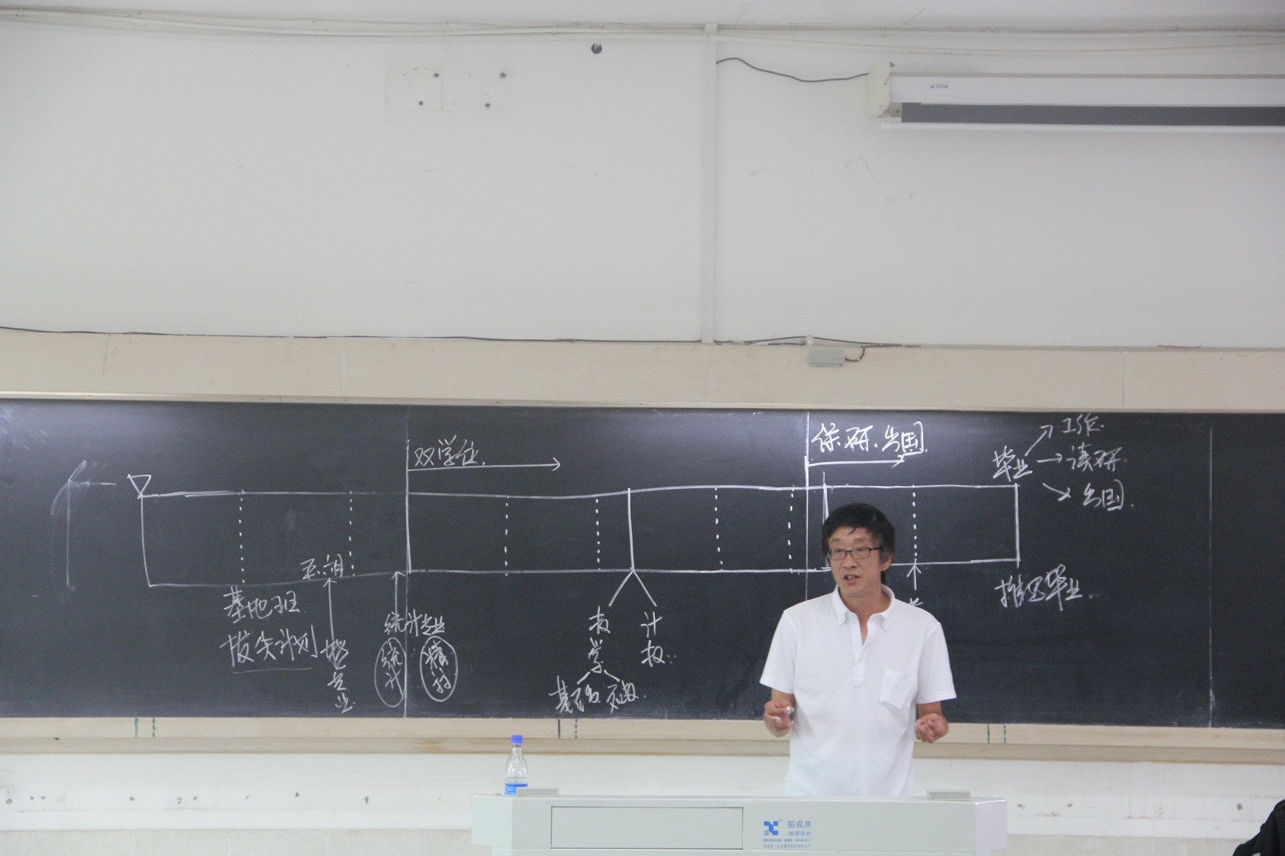 接下来钱建国副院长在黑板上画了数院本科学生学业时间轴,将4年来学生学习的大事化为轴上一点,生动明了地告诉家长、学生每个时间点要发生的事情,并提醒家长、学生要做哪些准备。钱建国副院长对大学的规划及安排的介绍思路清晰,简单明了。他指出尤其是刚开始要注重中学与大学的衔接,及时调整孩子的心态,以避免孩子没适应大学对以后学习造成影响。“中学老师可能每一点都非常详细,但大学更看重自学能力。鼓励不畏艰难,发现数学中的乐趣。”