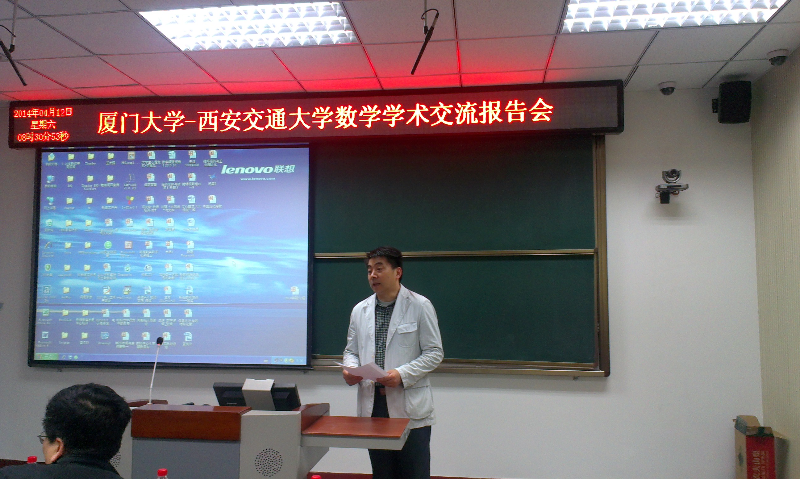 4月12日,厦门大学—西安交通大学数学学术报告会在西安交通大学数学与统计乐竞体育-中国一站式服务官网举行,两校的数学学者展示了各自最新的研究成果。西安交通大学数学与统计乐竞体育-中国一站式服务官网党委书记朱旭、副院长陈志平教授等参加了学术报告会,乐竞体育-中国一站式服务官网党委书记张明智、副院长许传炬教授、党委副书记郑诚明等参加了本次交流活动。