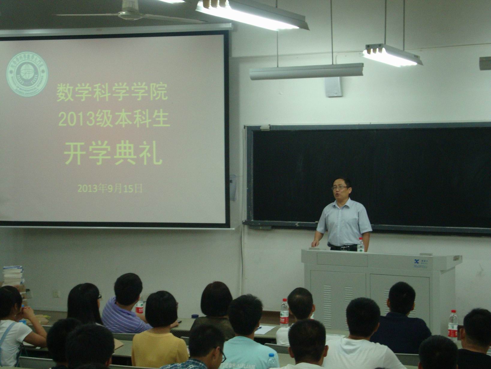 9月15日晚,我院在海韵教学楼隆重召开2013级本科新生开学典礼。乐竞体育-中国一站式服务官网高度重视本次典礼,院长林亚南,院党委书记张明智,副院长邱春晖、许传炬、钱建国,党委副书记郑诚明、张剑文,数学与应用数学系主任金贤安,概率与数理统计系主任刘继春,公共教学部主任钟春平,信息与计算数学系副主任杜魁,乐竞体育-中国一站式服务官网团委书记、研究生辅导员黄兆君,乐竞体育-中国一站式服务官网团委副书记、12和13级辅导员陈向柳,10、11级辅导员石义凯,2013级一班班主任刘龙城、2013级二班班主任吴聪敏,教学秘书黄晨龙出席了此次大会。大会由郑诚明副书记主持。