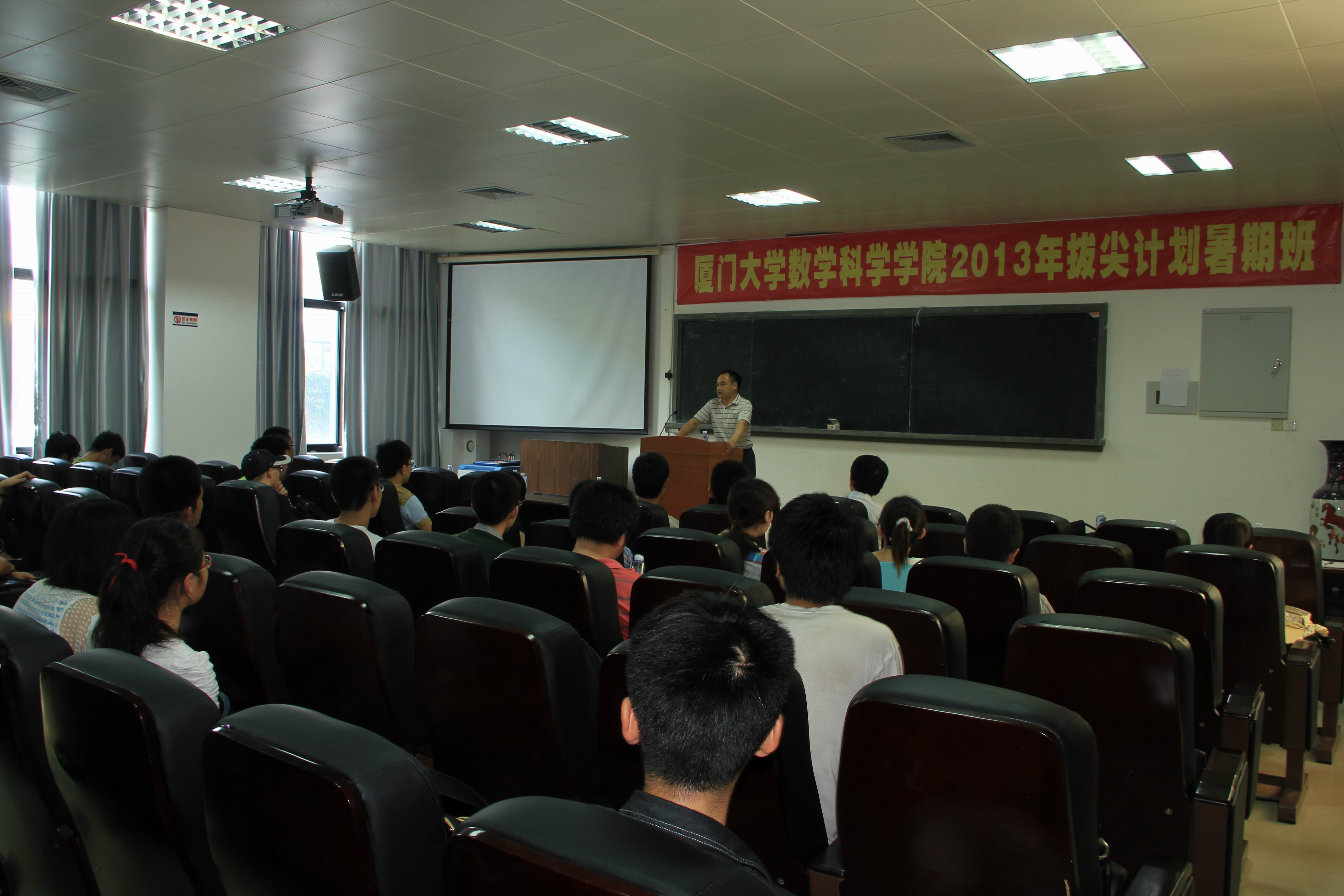 为期三周的乐竞体育-中国一站式服务官网拔尖计划暑期班于2013年7月22日正式开班,来自兰州大学、南开大学、南京大学、四川大学、武汉大学、厦门大学六所著名高校的数学学科拔尖计划的37名学生共聚厦门大学,开启了这场求学之旅。学校教务处副处长薛成龙、院长林亚南教授、副院长邱春晖教授、厦门大学国家级高层次人才、美国Ohio州立大学教授、党委副书记郑诚明、数学与应用数学系副主任刘轼波教授、辅导员石义凯老师以及本期暑期班全体学员出席了开幕式,开幕式由钱建国副院长主持。
