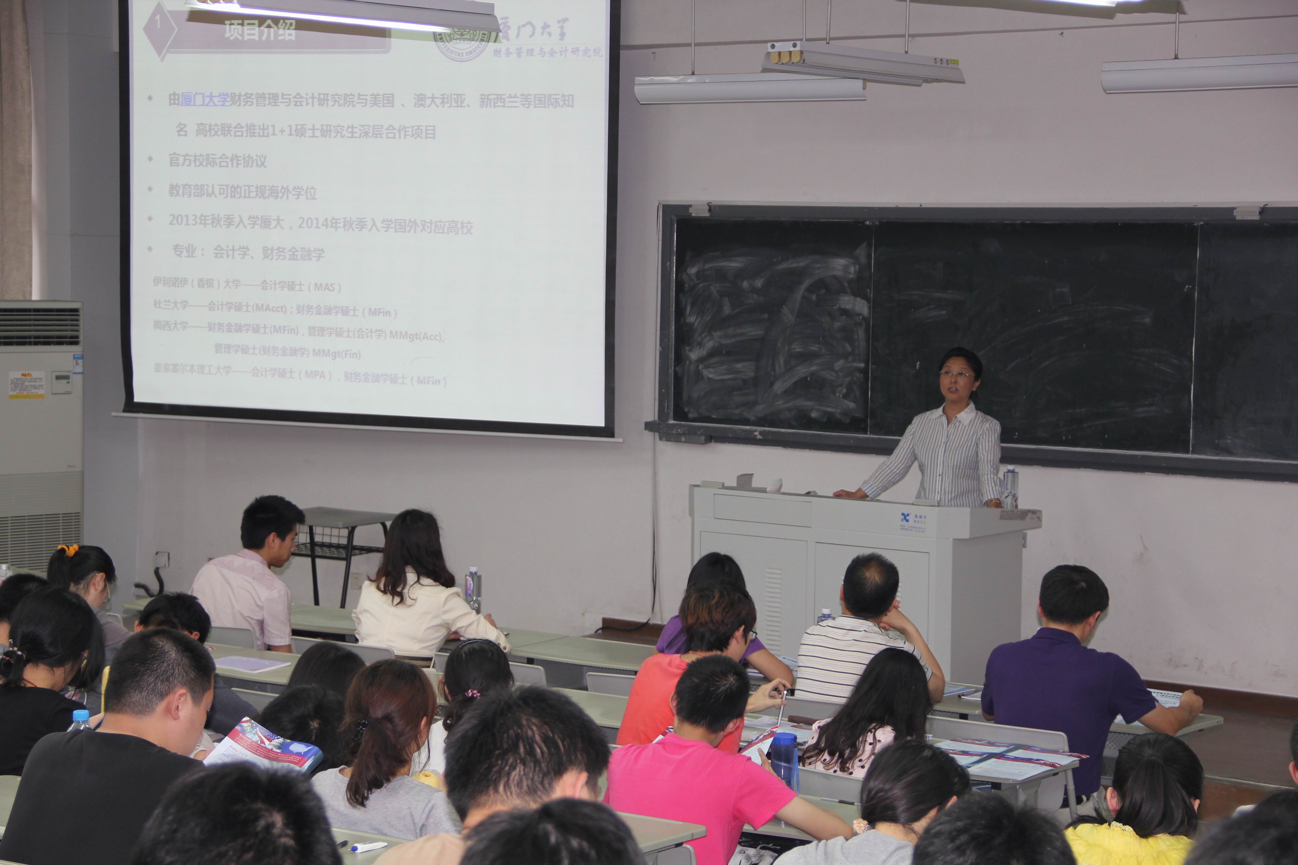 介绍会上,张国华教授主要就我校财务管理与会计研究院的综合实力、1+1联合办学项目的独特优势、与之联合办学的美国伊利诺伊(香槟)大学、美国杜兰大学、新西兰梅西大学、澳大利亚皇家墨尔本理工大学做了详细介绍。厦门大学财务管理与会计研究院的学术带头人和教学科研骨干长期活跃于国内外学术舞台,具有丰富的教学、科研和咨询培训经验,并且与政府机关和实务部门保持广泛的联系。通过该项目,学员可以同时享有厦门大学财务管理乐竞体育-中国一站式服务官网与国外大学优质的教育资源,而教育部认证的国外学位证书和厦门大学及IFAS卓越的学术声誉,将为学生提供更为广阔的就业前景。