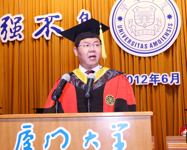 朱崇实首先致辞,代表全校师生员工向毕业生们致以最热烈的祝贺和最美好的祝福,向毕业生们的师长、亲人和朋友致以最崇高的敬意和最衷心的感谢。他在致辞中和毕业生们分享了自己对厦大校园的品味和感悟。