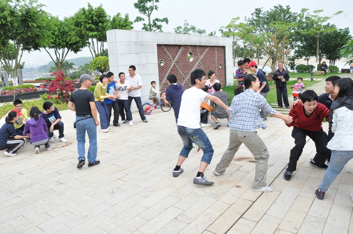 下午三点半,同学们在海滨大道旁的公园里进行了一系列团队合作训练。齐眉棍是同学们面对面伸出手指,然后把架在手指上的棍子一同往下降。看似简单实则不然,每一组都出现了棍子不降反升的现象,这项游戏考验的是协作能力与互相的信任,耐人寻味反思。第二个训练项目叫激情节拍,同学们分成两组进行比赛,用手拍前一个人的后背一下,再转身喊出“我”,然后是两下,喊出“我们”……直至喊出“我们是最棒的团队”,此游戏有利于激发大家的整齐划一的团结协作精神,两组队员进行了比赛。最后一个训练项目叫“超市买菜”,每个男生代表一块钱,女生代表五毛,在导游喊出菜价时,大家要迅速找到组成菜价的伙伴一起蹲下,该游戏锻炼人的反应能力。