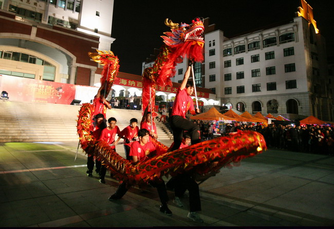 活动一开始,艺术乐竞体育-中国一站式服务官网舞蹈队10名美丽俏皮的花旦们红红火火闹新年,立刻将现场师生们聚集到了一起,共同感受着节日的喜悦;紧接着,体育部舞龙队珠引龙腾,在广场上跳跃、扑腾、登高、翻转、踩球,更是博来观众们一阵阵热烈的掌声。穿插中间的竞技健美操表演和经济乐竞体育-中国一站式服务官网赖春燎老师的一曲《今夜无人入睡》,一次又一次地将活动推向高潮。各个部门工会精心准备了形式多样、精彩纷呈的小游戏,广场上人潮涌动,四处排起长龙,歌声与欢笑交融,灯火与霓虹辉映,喝彩与掌声共鸣,幸福和欢乐洒满了整个校园。
