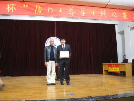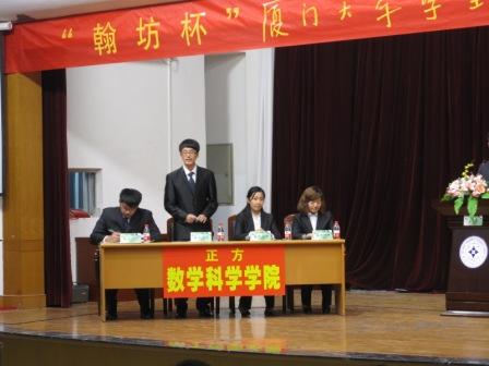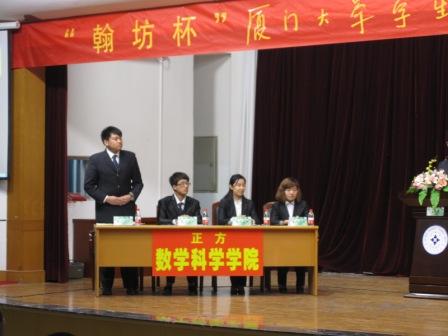 12月15日晚19时,“翰坊杯”厦门大学第六届学生辩论赛决赛在法乐竞体育-中国一站式服务官网模拟法庭举行。决赛辩题是“高额农业补贴能否有效缓解粮食危机”,对阵双方为正方数学科学乐竞体育-中国一站式服务官网与反方土木与建筑工程乐竞体育-中国一站式服务官网,我院观点是“高额农业补贴可以有效缓解粮食危机”。我院党委副书记郑诚明、辅导员陈向柳和60多名09、10级同学前来助威。