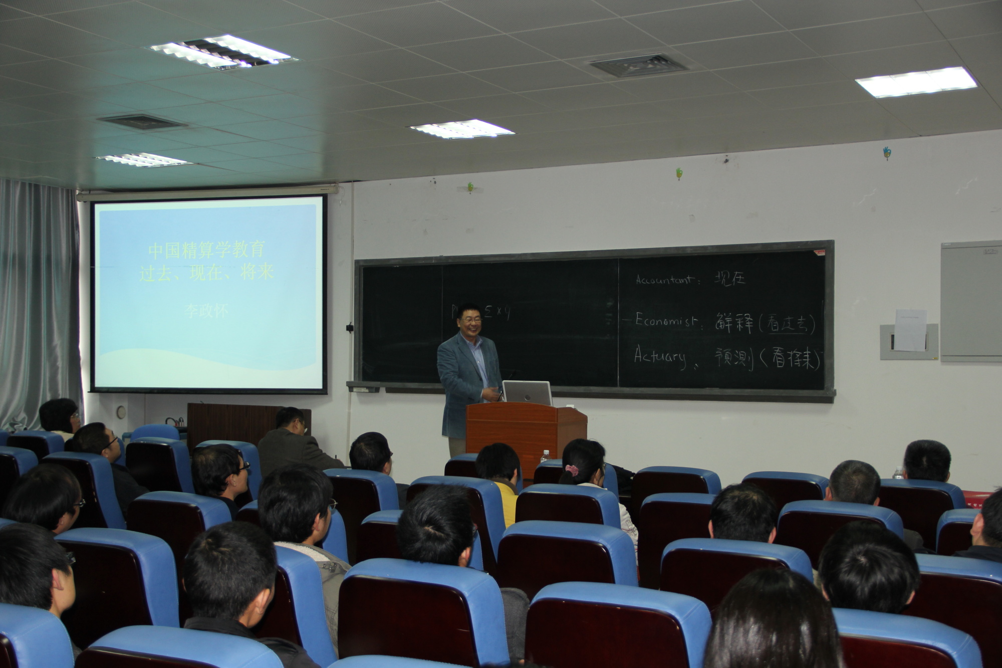 李政怀先生从Accountant、Economist、Actuary三个单词开始,解释了他对精算科学的理解。他结合自己的亲身经历,向到场师生介绍了中国精算科学发展历程和未来趋势,介绍了中国精算师协会的情况和工作计划,讲授了精算师考试的科目设置和目前社会对精算师的需求情况。精彩的报告受到与会教师和学生的欢迎。
