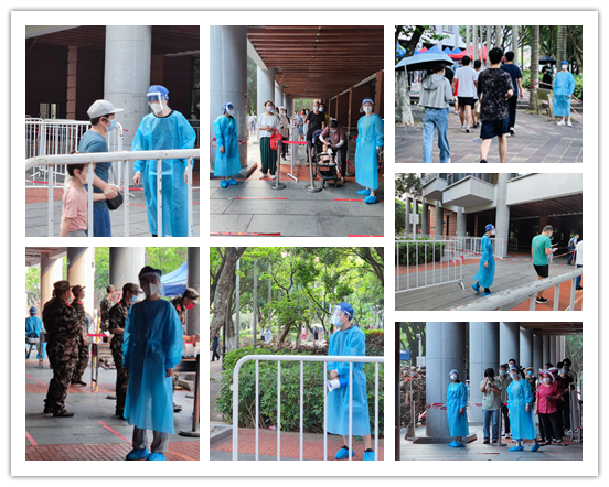 9月18日早上6:30和8:30,12名教工党员分两批准时到达设在科学艺术中心的核酸检测点,在专业人员的指导下迅速穿好防护服,戴好口罩、面屏、手套,准时就位开展维护秩序、现场引导等工作。由于本轮核酸检测时间安排较为集中,军训学生成批参加检测等原因,核酸检测点人流量较大,加大了志愿者的工作难度,但老师们针对现场情况不断完善工作分工和方案,优化工作细节,把上高数课的严谨、热情、细致、耐心用于志愿服务,最终圆满完成核酸检测各项任务,受到现场师生的高度评价。