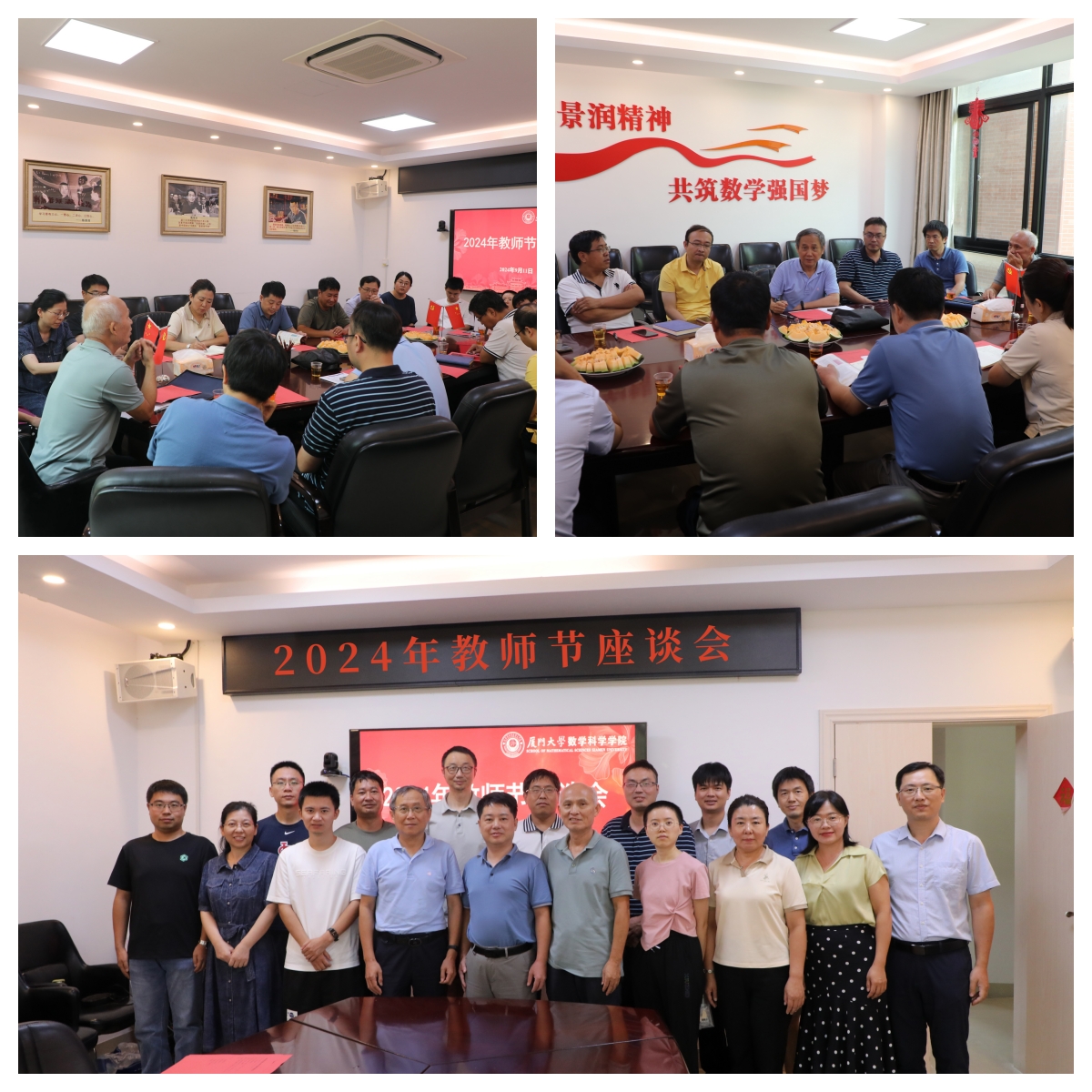 为热烈庆祝第四十个教师节,2024年9月11日上午,数学科学乐竞体育-中国一站式服务官网在海韵园行政楼B312会议室召开以“大力弘扬教育家精神,加快建设教育强国”为主题的教师节座谈会。院党委书记张清榕,院党委副书记毛通双,丁昌利,院党委委员、副院长金贤安,院党委纪检委员、工会主席张文出席,老中青教师代表参加会议。座谈会由毛通双主持。