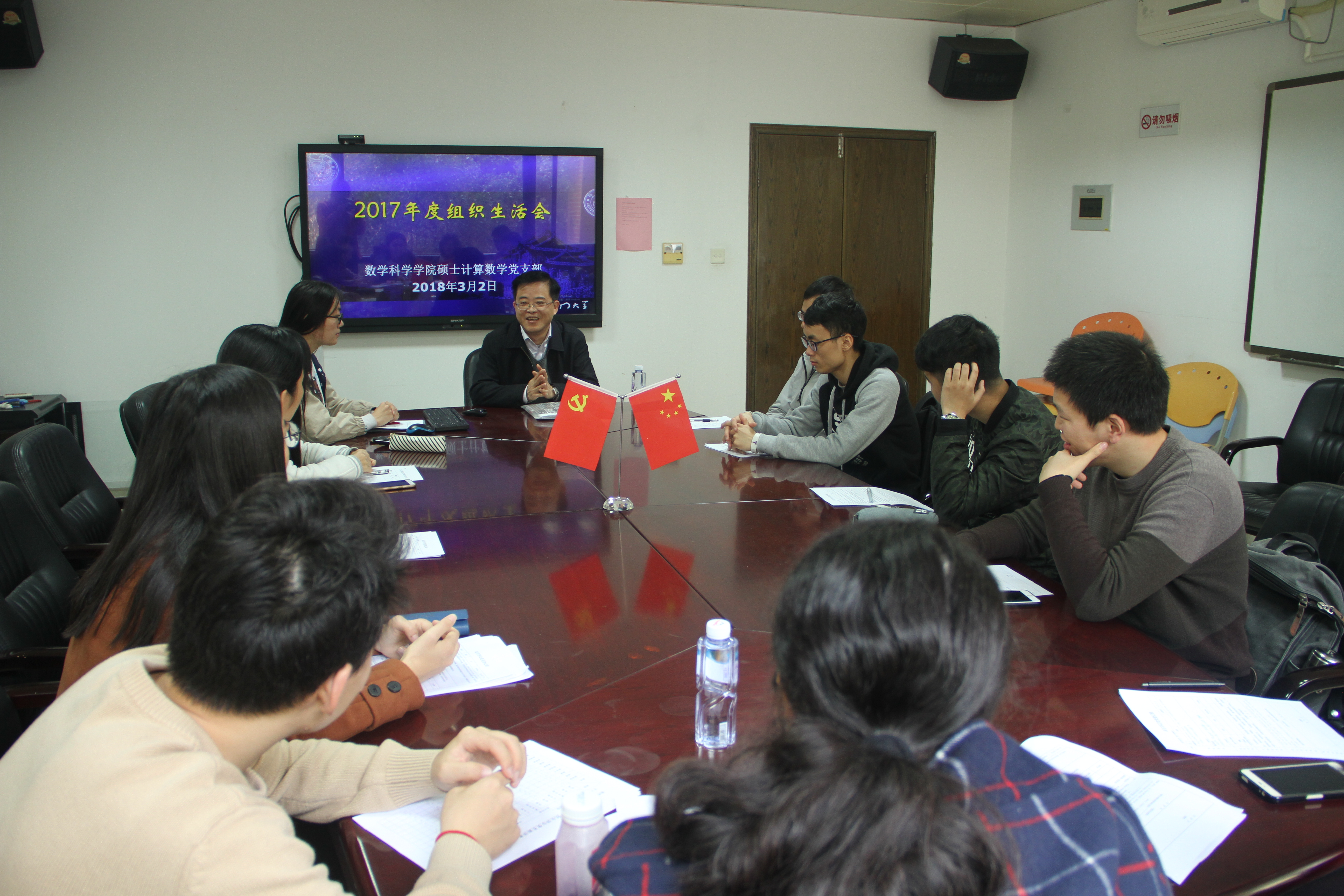2018年3月2日上午,硕士计算数学党支部在行政楼313会议室召开2017年度组织生活会,开展党员民主评议。乐竞体育-中国一站式服务官网党委书记黄宝秋作为支部联系领导出席会议并讲话,会议由支部书记韩萌主持。