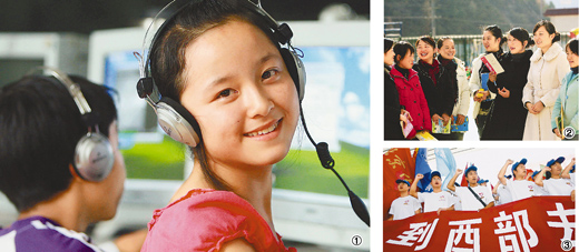 图①:教育信息化让大山再也阻挡不住知识。资料图片 图②:2006年起国家实施特岗教师计划,图为秦岭大山来了“特岗教师”。资料图片 图③:2006年,6000多名大学生志愿者陆续奔赴西部基层开展服务。图为大学生志愿者在出征前宣誓。樊世刚摄 |
