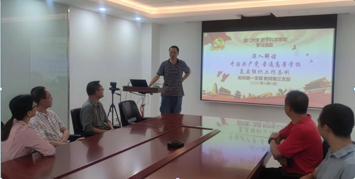 6月8日,数学科学乐竞体育-中国一站式服务官网教师第一党支部和第三党支部在天元中心会议室联合开展“固定党日+”活动,集中学习《中国共产党普通高等学校基层组织工作条例》。