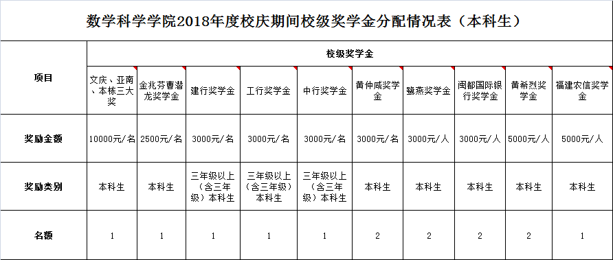 2018年校庆期间将评选颁发“文庆奖学金”、“本栋奖学金”、“亚南奖学金”等多项校级奖学金,现将各项奖学金评奖工作的有关事项通知如下: