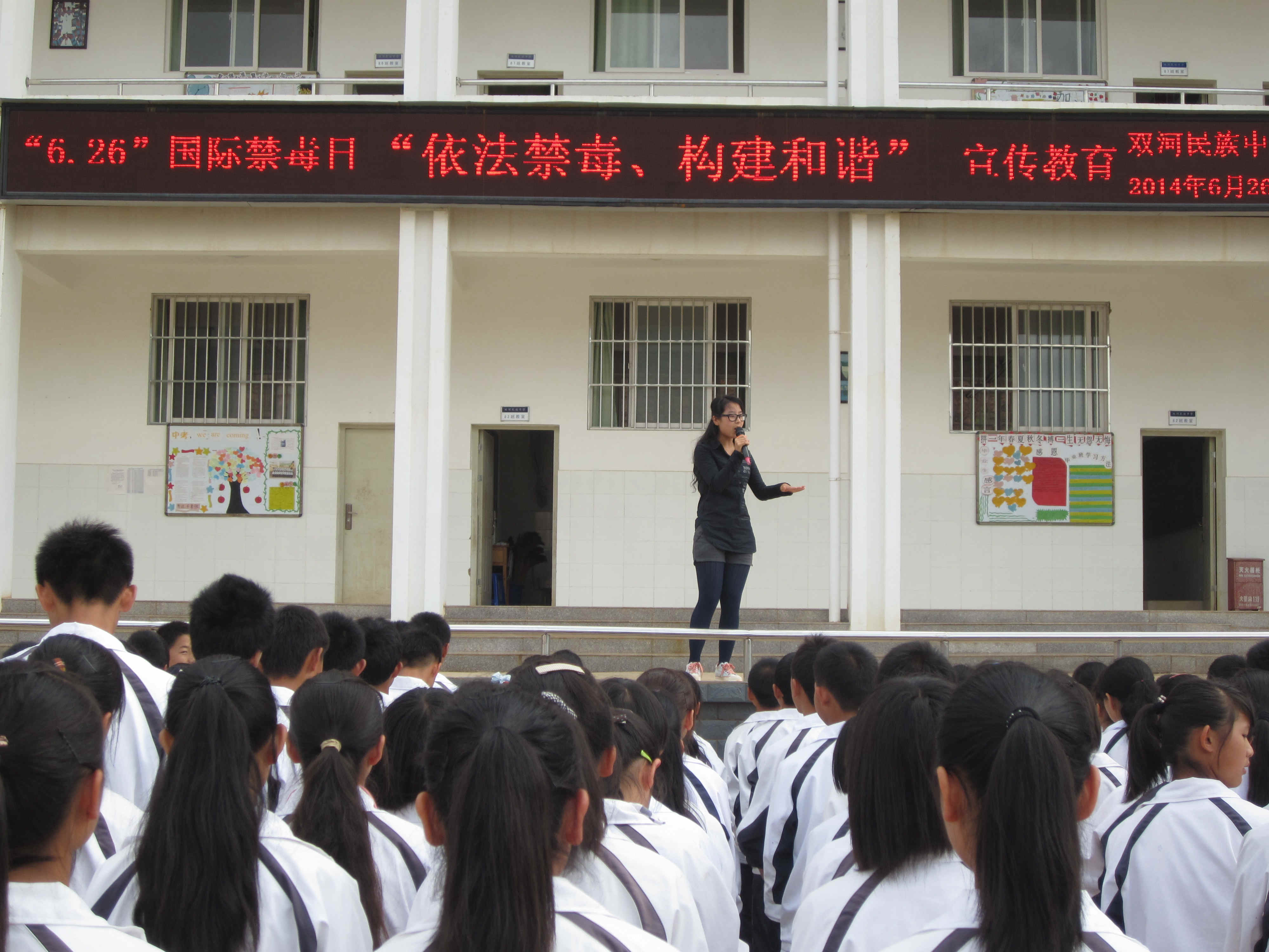 626日国际禁毒日,在双河民族中学“依法禁毒、构建和谐”的宣传教育活动上,我院晋宁双河实践队临时党支部书记杨应越代表实践队向学生宣传禁毒知识。