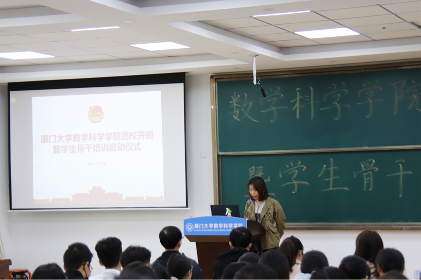 11月23日,数学科学乐竞体育-中国一站式服务官网团校开班仪式暨学生骨干培训启动仪式在海韵实验楼106举行。乐竞体育-中国一站式服务官网党委副书记丁昌利,团委书记于正伟,团委副书记陈淑铌,辅导员华盈鑫,2020级本科生班主任聂嘉明,2021级本科生班主任黄灿,兼职辅导员程琦秦,本科生团总支、学生会、宣传中心主席团,各部门负责人以及全体参训同学参加启动仪式。