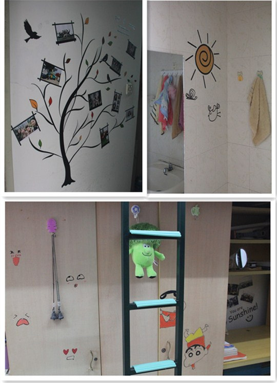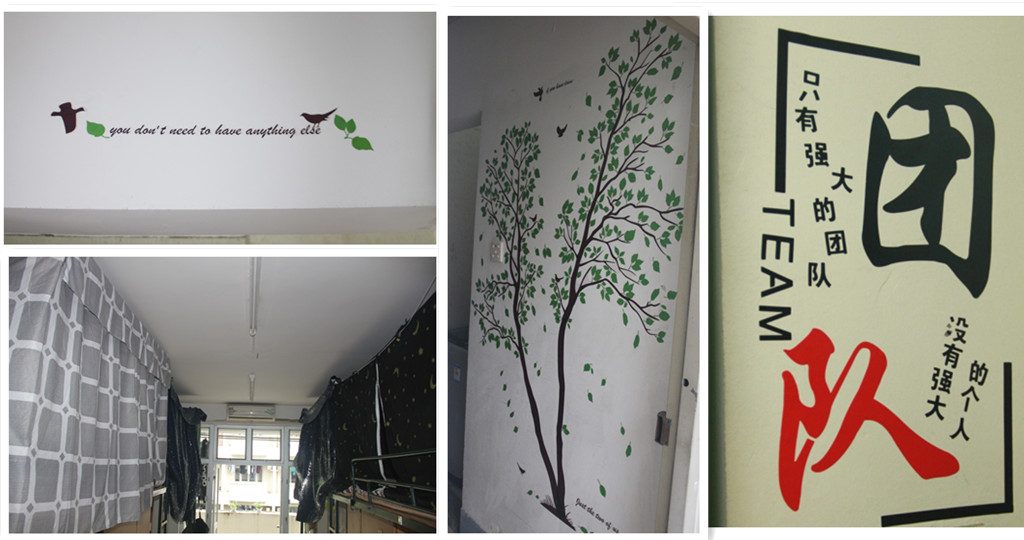 H3-422:“我们不想拯救世界,我们只想栖息在自己的小窝。”这是由叶程、赵启文、李镇宇、吴斐组成的422寝室的宣言。大树枝繁叶茂,让人眼花缭乱,而一句标语和两只飞鸟,简单又不失精致。他们还有励志墙贴,“青春”、“拼搏”、“团队”、“习惯”,积极向上的寝室氛围和谐感人。