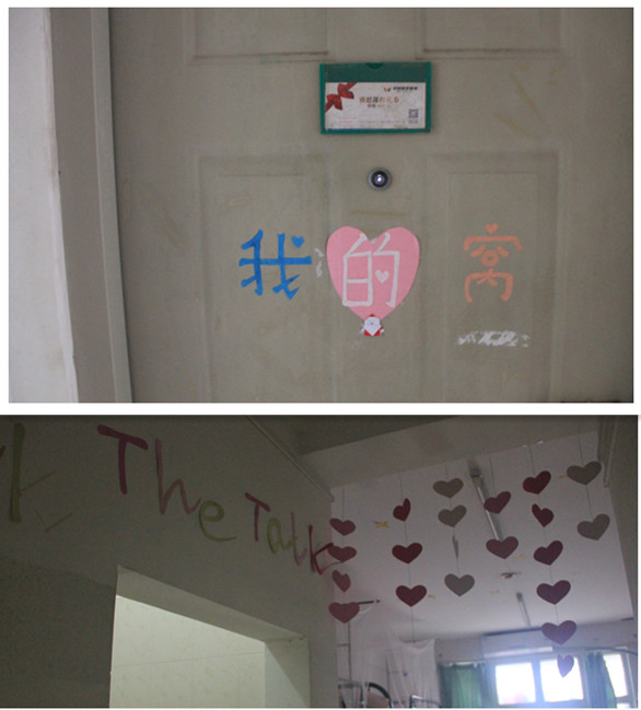 H5-309 ,这是一个门牌上写着“我的窝”的寝室,开门看到的就是心形手工吊饰。寝室里整洁,一尘不染,连洗漱台边的瓷砖都干净明亮。这个温暖明亮的寝室给人一种小家的温馨。这个寝室的成员有邹儒雅、张志洋、于洋,她们的宣言是“宿舍是我家,美丽靠大家!”。