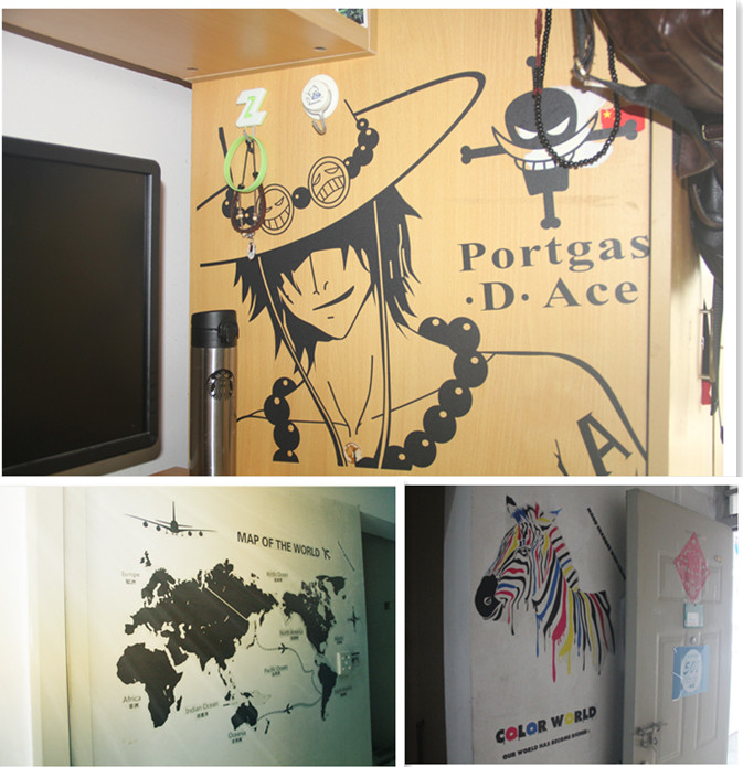 H5-207 ,这是一个叫“时代四撒姐妹花”的寝室,成员是王辰晔、郑家琳、翟紫雪、于凭跃。一打开门,就是粉与黑的照片墙——照片与值日表的结合。点缀着的手工、贴纸精致可爱,在装点小窝的同时,也传达出寝室的温馨可爱,她们的宣言是“为中华之崛起而美化宿舍!”。