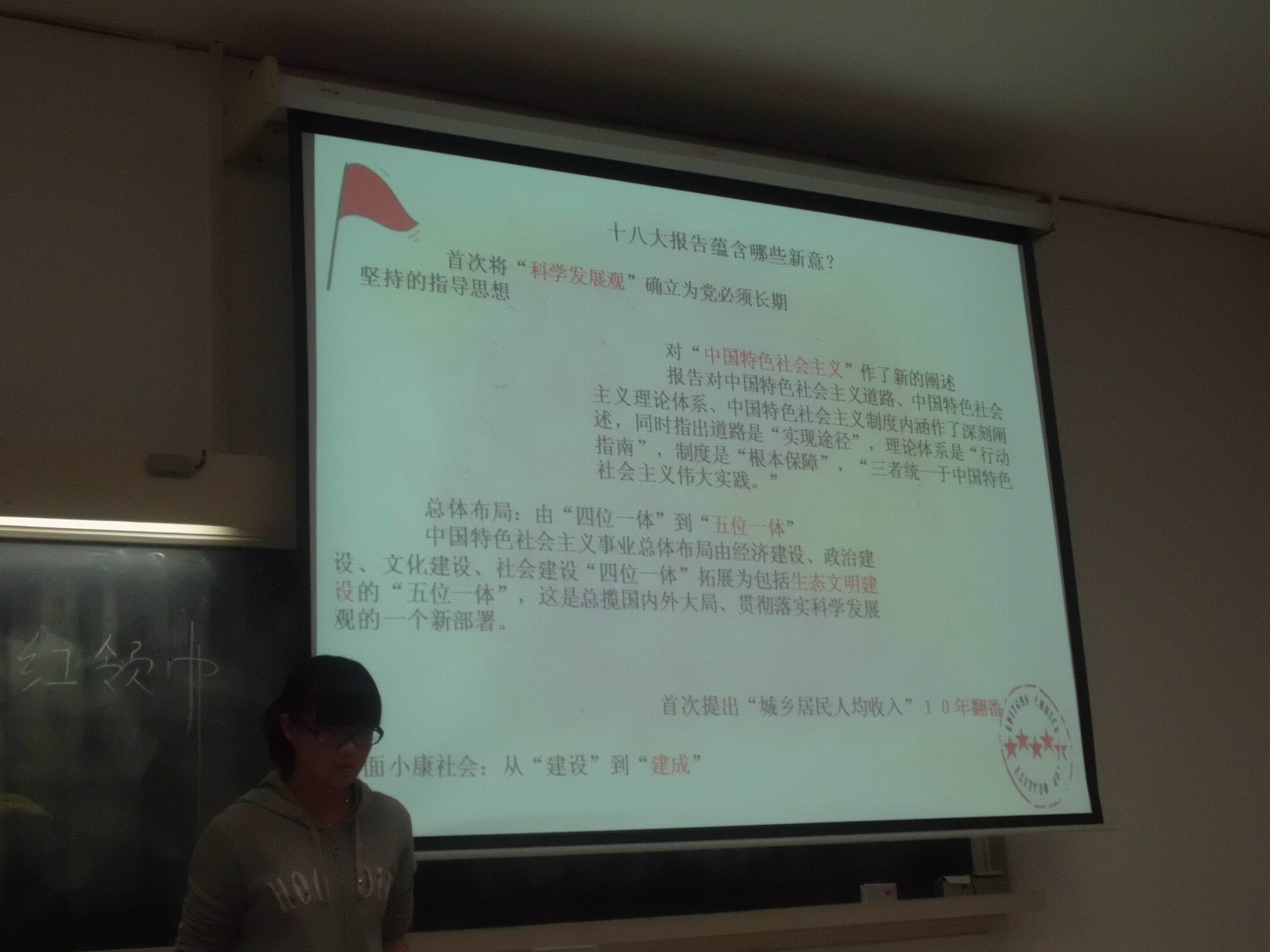 本次团课以“贺祖国喜迎十八大,数学人热血跟党走”为主题,以深入了解十八大中心思想,积极加强支部的建设,为党的发展培养更多优秀人才为主旨,在2班班委的集体努力下顺利召开。辅导员石义凯受邀参与了本次团课。