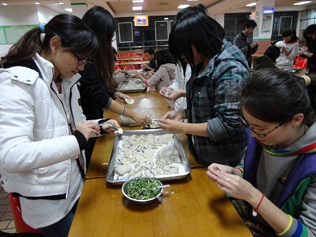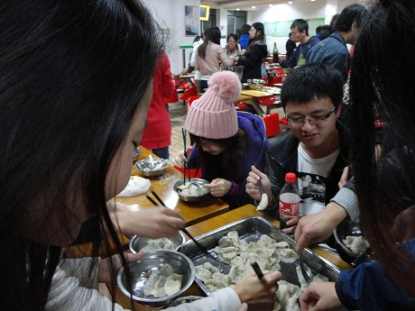下午6时,活动开始。同学们怀着极大的热情投身到包饺子的行列中,不多时,盘中排列着各式各样风格迥异的饺子。虽然很多饺子的质量可能不怎么的,但大家乐在其中,热情不减。包完了饺子就该吃饺子了,往往一盆饺子端上来不多久,就被大家消灭殆尽了,亲手做的饺子,就是别有一番风味。